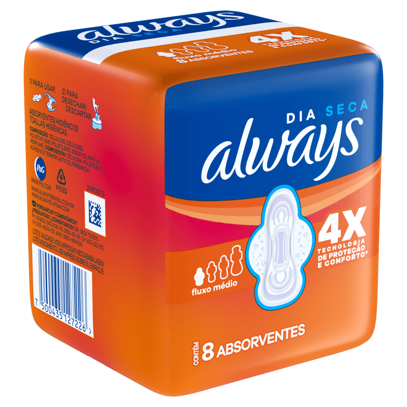 O que é: Absorvente Always Super Proteção Cobertura Seca com Abas possui formato anatômico, desenhado para a mulher brasileira, que se adapta ao seu corpo e calcinha, mantendo a umidade longe da sua pele.