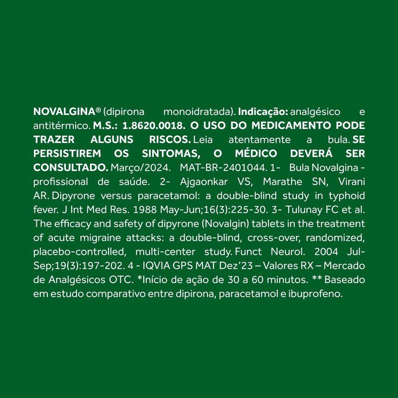 Novalgina é um medicamento. Seu uso pode trazer riscos. Procure um médico ou farmacêutico e leia a bula antes de usar. Evite a automedicação. Venda sob prescrição médica. Medicamento genérico conforme a lei n.º 9.787/99.