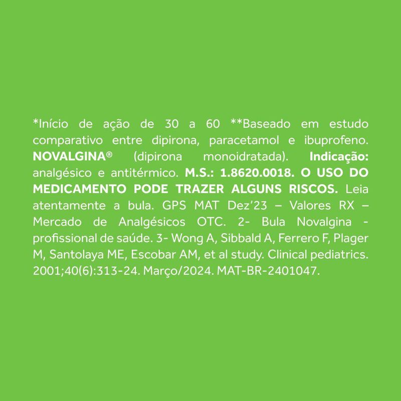 Novalgina deve ser utilizada conforme orientação médica, respeitando horários, doses e duração do tratamento. É um medicamento que requer prescrição médica. Medicamento genérico conforme a lei n.º 9.787/99.