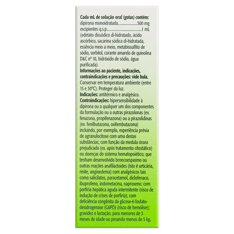 Contraindicado para menores de 3 meses, pessoas com alergia à dipirona ou a componentes relacionados, pacientes com problemas hematológicos, porfiria hepática, deficiência de G6PD, histórico de reações anafilactoides a analgésicos, e mulheres grávidas ou lactantes sem orientação médica.