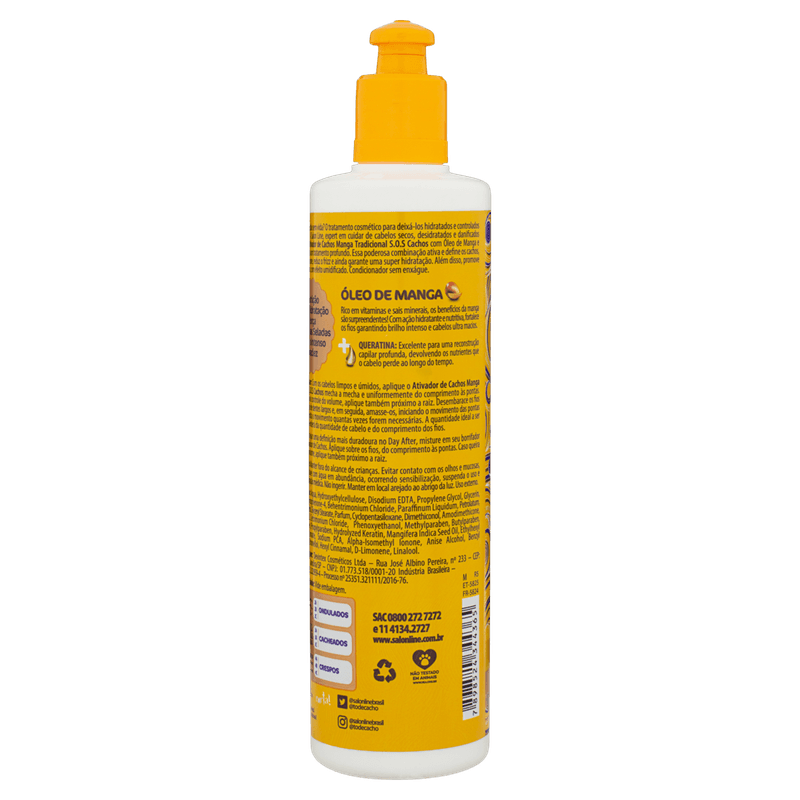 O ativador de cachos tem a função de ativar e definir os cachos de maneira mais especificas, deixando o cabelo muito mais definido. O Ativador de Cachos S.O.S Umidificador possui fórmula exclusiva com queratina e a combinação de óleo de maga e queratina. Com ativos hidratantes, ele forma uma película protetora e reconstrói os fios, revestindo a fibra capilar com uma barreira antiumidade durante todo o dia. Esse produto também pode ser considerado um condicionador sem enxágue, ou seja, é um ótimo umidificador de cachos que não pode faltar em sua rotina de cuidados, especialmente se você possui cabelo 3C ou 4ABC.