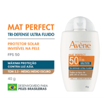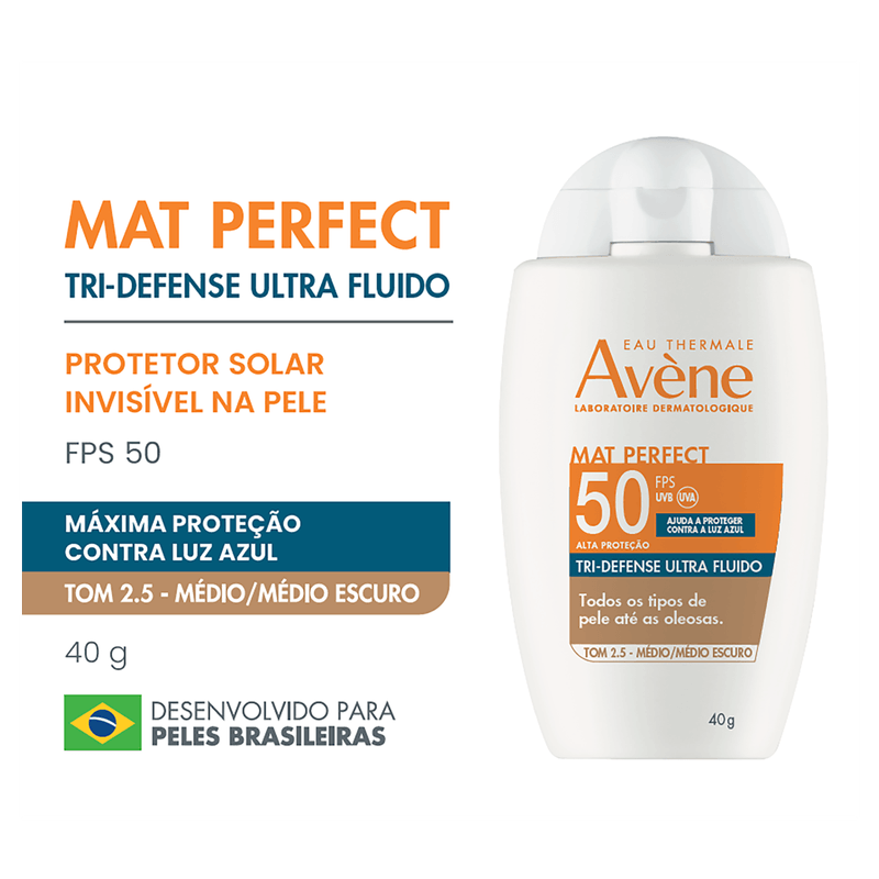 Novo Protetor Solar Avène Mat Perfect Tri-Defense Ultra Fluido FPS 50. É um protetor facial com alta proteção para todos os tipos de pele, até as oleosas. É o único no mercado que possui máxima proteção contra os raios UVB, UVA e a luz azul, em um filtro sem cor. Isso graças ao Triasorb, filtro exclusivo e patenteado de Avène, que previne e protege contra danos profundos ao DNA da pele, causados pela luz azul. Seus pigmentos ajudam a uniformizar o tom com uma cobertura natural, perfeita para o dia a dia. Ele tem textura ultra fluida, leve como água, com acabamento invisível na pele e sem textura pegajosa, absorvido imediatamente. Possui efeito matte e sua fórmula é eco-friendly e desenvolvida para preservar a biodiversidade marinha.