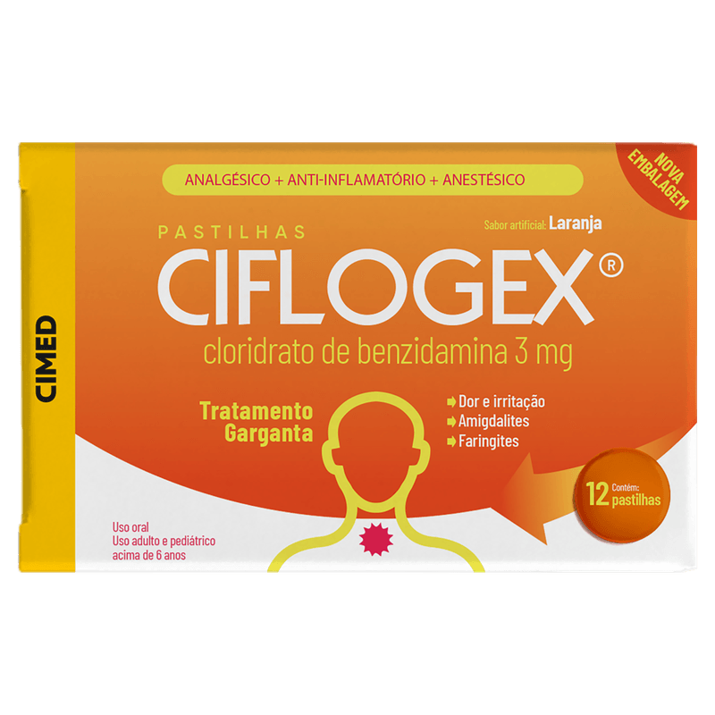 As Pastilhas para Garganta Ciflogex sabor Laranja são indicadas para o alívio de processos inflamatórios e dolorosos na boca e garganta, como aftas, dor de dente, inflamação da garganta, sintomas de gripes e resfriados, além de dores pós-traumáticas e pós-cirúrgicas bucais. Com 3 mg de cloridrato de benzidamina por pastilha, oferecem ação anti-inflamatória, analgésica e anestésica, proporcionando alívio rápido e auxiliando na recuperação local. São ideais para adultos e crianças acima de 6 anos que buscam conforto e eficácia no tratamento dessas condições.