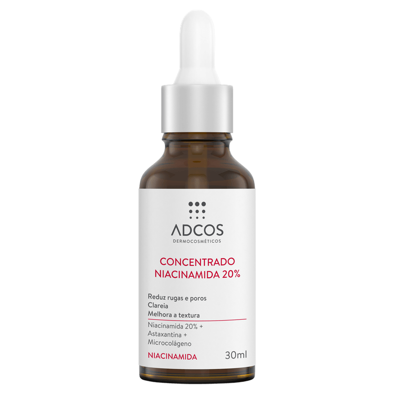 O Sérum Concentrado Niacinamida 20% Âmbar Adcos é um poderoso anti-idade que atua na redução de rugas, linhas finas e poros dilatados, além de clarear e melhorar a textura da pele. Com alta concentração de niacinamida, astaxantina e microcolágeno, oferece proteção contra luz azul e poluição, fortalecendo a barreira cutânea para uma pele mais uniforme, hidratada e saudável.