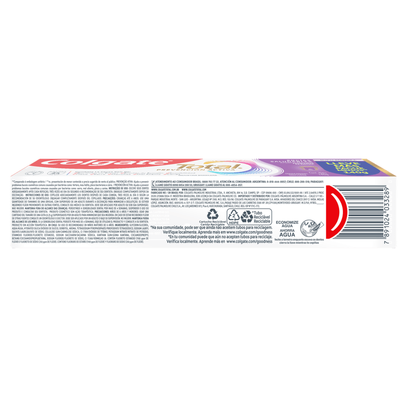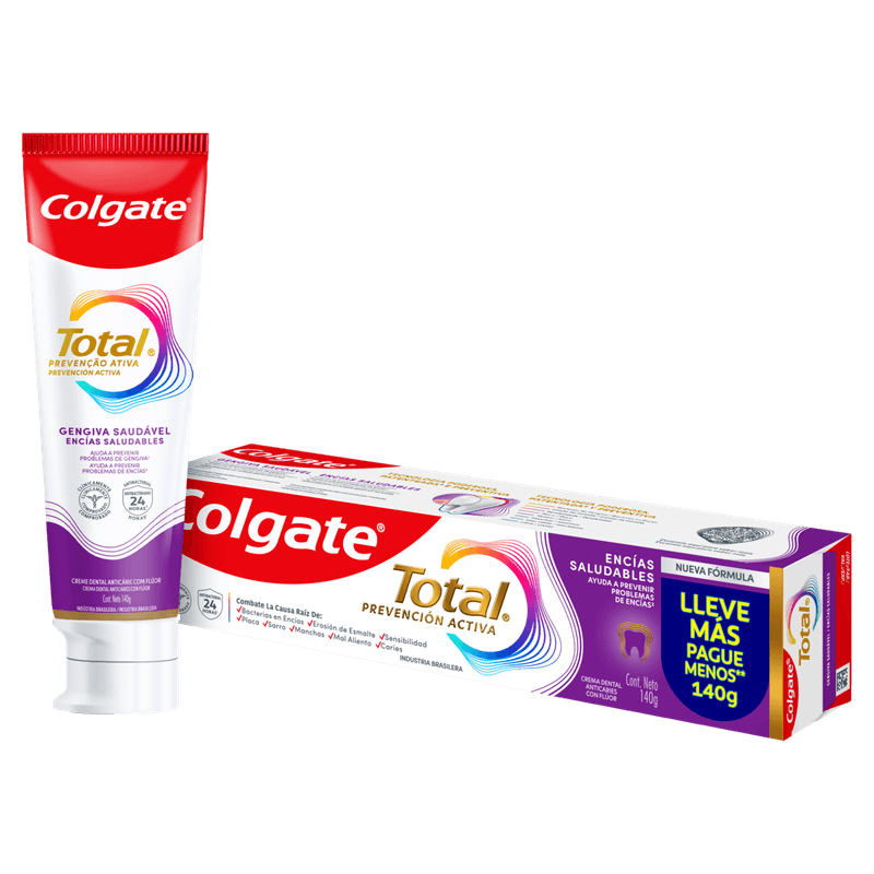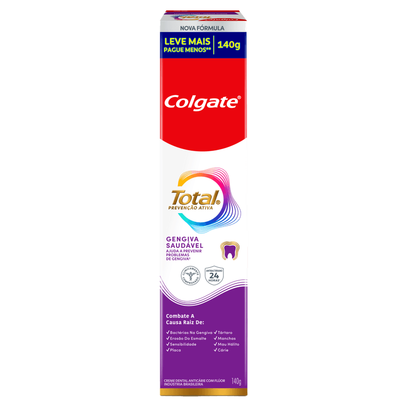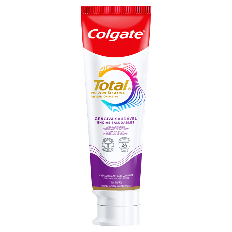 A pasta de dente Colgate Total 12 Gengiva Reforçada, com fórmula avançada e antibacteriana, garante até 12 horas de defesa ativa que reforça sua gengiva contras as bactérias com o uso contínuo. Ajuda a prevenir o sangramento gengival (O uso diário do regime Colgate Total 12 (creme dental e enxaguante bucal) remove a placa para ajudar a prevenir o sangramento gengival causado pelo acúmulo de bactérias. Produto cosmético sem ação terapêutica.)