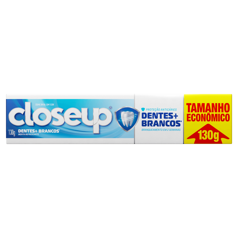 • Creme Dental Closeup Dentes + Brancos* foi desenvolvido com ingrediente que deixa os dentes mais brancos em 2 semanas • Protege contra as cáries • Fórmula com sabor refrescante de menta, com um toque único de notas de anis e eucalipto • O creme dental para branqueamento ajuda na remoção de manchas da superfície dos dentes • Closeup Dentes + Brancos* contém flúor na sua formulação que contribui para a saúde bucal • Fórmula que ajuda a remover a placa** O Creme Dental Closeup Dentes + Brancos* possui em sua fórmula o benefício de deixar seus dentes mais brancos e saudáveis. Sua fórmula atua no esmalte dos dentes, ajudando na redução de manchas acumuladas com o tempo sobre a superfície dental, manchas essas provenientes de alimentos e bebidas como o café. Closeup Dentes + Brancos* contribui para a sua saúde bucal, protegendo os seus dentes contra as cáries por conter flúor em sua fórmula. O sabor menta refrescante, apresenta notas de menta específicas (peppermint menthol), acrescentadas de uma combinação única de notas de anis e eucalipto, com um toque sutil de maçã. Experimente o Closeup Dentes + Brancos para você ter confiança de chegar mais perto! O creme dental para branqueamento está disponível no tamanho de 90g e 130g. Ao escovar seus dentes todos os dias após as refeições com o creme dental Close Up e escova de dente, você cuida da sua saúde bucal e garante um hálito fresco.