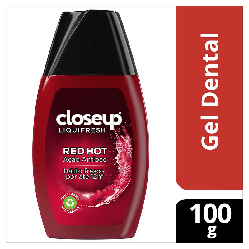 O Gel Dental Closeup Liquifresh Red Hot proporciona hálito 3x mais fresco*. Além disso, é prático (você nem precisa molhar sua escova de dente!) e portátil. Sua consistência permite seu uso tanto como pasta de dente quanto como enxaguante bucal (sendo aplicado na escova de dente ou diretamente na boca). Sua fórmula apresenta ingredientes de enxaguante bucal com Active Zinc que ajuda a eliminar até 99% das bactérias causadoras do mau hálito*. Contém também cristais micro-shine que ajudam a deixar os dentes mais brancos a cada uso. O sabor Red Hot apresenta notas picantes de cravo combinadas com notas de menta específicas (menthol-wintergreen), proporcionando uma duradoura sensação gelada de frescor. Aprecie a explosão de refrescância do sabor Closeup Liquifresh Red Hot e revele o branco natural do seu sorriso. Hálito fresco e dentes mais brancos para você ter confiança de chegar mais perto. O Gel Dental Closeup Liquifresh está disponível no tamanho 100g. Experimente também a outra variedade desse creme dental em gel, o Closeup Liquifresh Ice. Ao escovar seus dentes todos os dias após as refeições com creme dental e escova de dentes Closeup, você os protege contra as bactérias e o mau hálito. *Estudo in vivo com redução de mau hálito após 4 semanas de uso regular.