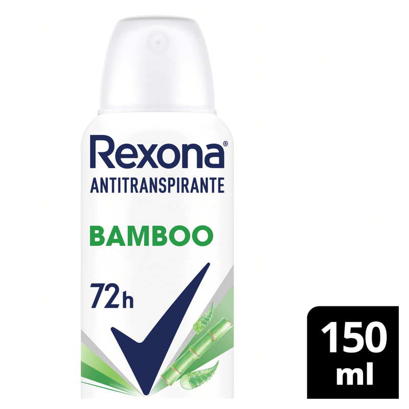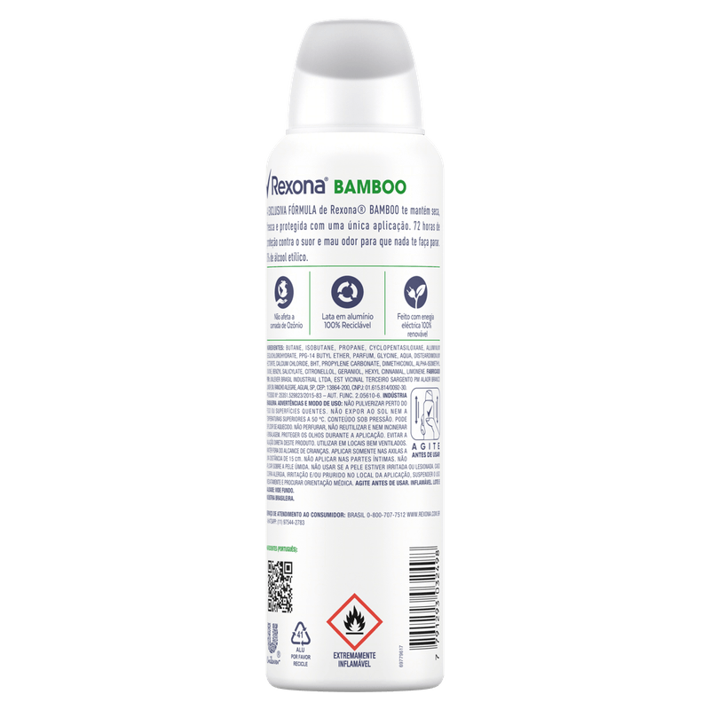 Sem álcool etílico e sem corantes, o Desodorante Antitranspirante Aerosol Rexona Bamboo garante 72 horas de proteção seca e intensiva contra o suor. Sua fórmula conta com Tecnologia MotionSense, composta por exclusivas microcápsulas que são quebradas pelo atrito dos movimentos, liberando proteção extra ao longo do dia, proporcionando sensação de frescor, conforto e segurança a cada novo movimento e por muito mais tempo.