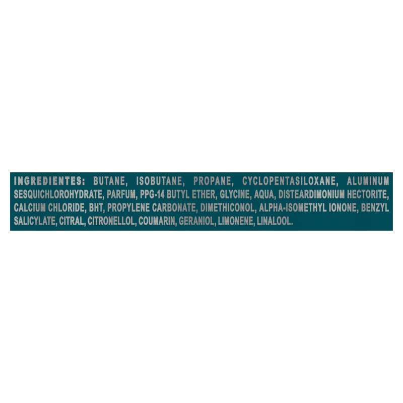 Composição: butane, isobutane, propane, aluminum chlorohydrate, cyclomethicone, ppg-14 butyl ether, parfum, disteardimonium hectorite, sodium starch octenylsuccinate, maltodextrin, hydrolyzed corn starch, silica, bht, caprylic/capric triglyceride, hydrated silica, gelatin crosspolymer, aqua, cellulose gum, sodium benzoate, propylene carbonate, alpha-isomethyl ionone, benzyl salicylate, butylphenyl methylpropional, citral, citronellol, coumarin, geraniol, hydroxycitronellal, limonene, linalool.