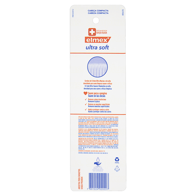 Escova Dental Elmex Ultra Soft possui mais de 5500 cerdas ultrafinas (0,1mm), ultra macias e de alta densidade para uma limpeza suave e eficaz.