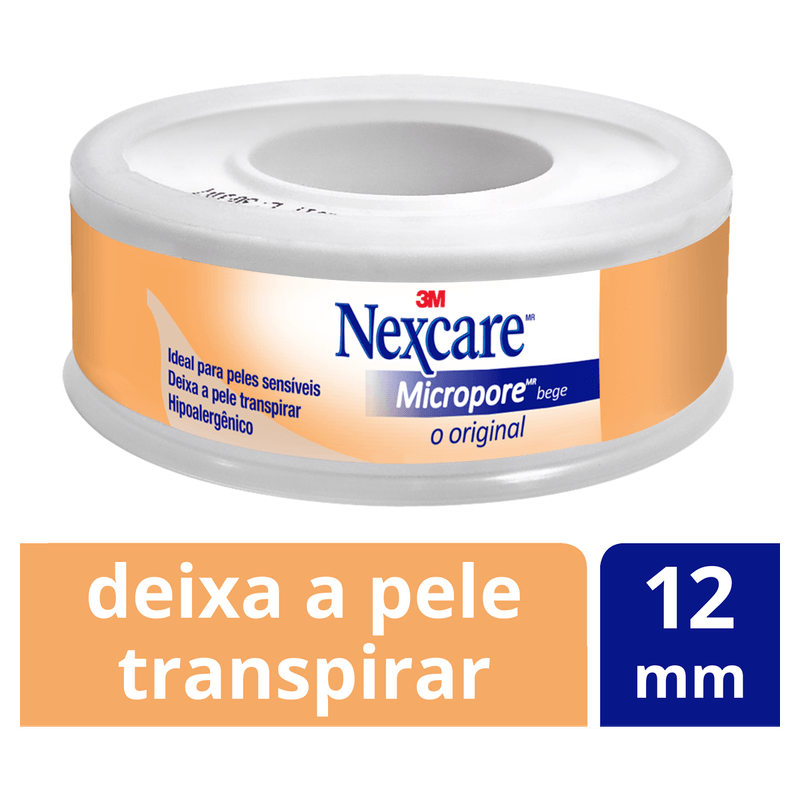 Fita Micropore Nexcare® Bege - 12 mm x 4,5 m. A Fita Micropore Nexcare® Bege é a escolha número um em fitas hospitalares. Ela foi projetada para ter o máximo de suavidade, não interferindo nas funções normais da pele e permitindo que ela transpire para melhor conforto. É perfeita para a fixação de curativos, gazes, cateteres, sondas e curativos de drenos. Feita na cor bege, ela é mais discreta na pele. Cuidamos e protegemos cada centímetro da sua pele! A Fita Micropore Nexcare® Bege é a escolha número um em fitas hospitalares. Ela foi projetada para ter o máximo de suavidade, não interferindo nas funções normais da pele e permitindo que ela transpire para melhor conforto. É uma fita microporosa perfeita para a fixação de curativos, gazes, cateteres, sondas e curativos de drenos, sem deixar resíduos ou irritações na pele – por sua fácil remoção, ela é ótima para mudanças frequentes dos curativos ou gazes, sendo ideal para peles sensíveis. Feita na cor bege, esta fita Micropore é mais discreta na pele. A Fita Micropore Nexcare® Bege não sai na água, pode ser aplicada diretamente no machucado e é hipoalergênica. É flexível e perfeita para áreas difíceis de cobrir, garantindo conforto ao usuário. Além disso, ela corta facilmente no tamanho que você precisa. Trata-se de um esparadrapo Micropore dermatologicamente testado que faz parte da linha completa de fitas médicas da 3M, que alia uma variedade de soluções com alta qualidade e tecnologia. Experimente o esparadrapo Nexcare® que melhor atende à sua necessidade e sinta a diferença. Conheça este item indispensável em seu kit de primeiros socorros! Fita Micropore® bege projetada para ter o máximo de suavidade, não interferindo nas funções normais da pele, não deixa resíduos ou irritações na pele, não sai na água, pode ser aplicada diretamente no machucado e é hipoalergênica. Permite que a pele transpire para melhor conforto, é flexível e perfeita para áreas difíceis de cobrir. Fita Micropore® cor da pele que corta facilmente no tamanho que você precisa com a tecnologia Micropore Nexcare®. Ideal para fixação de curativos, gazes, cateteres, sondas e curativos de drenos, ótima para peles sensíveis.