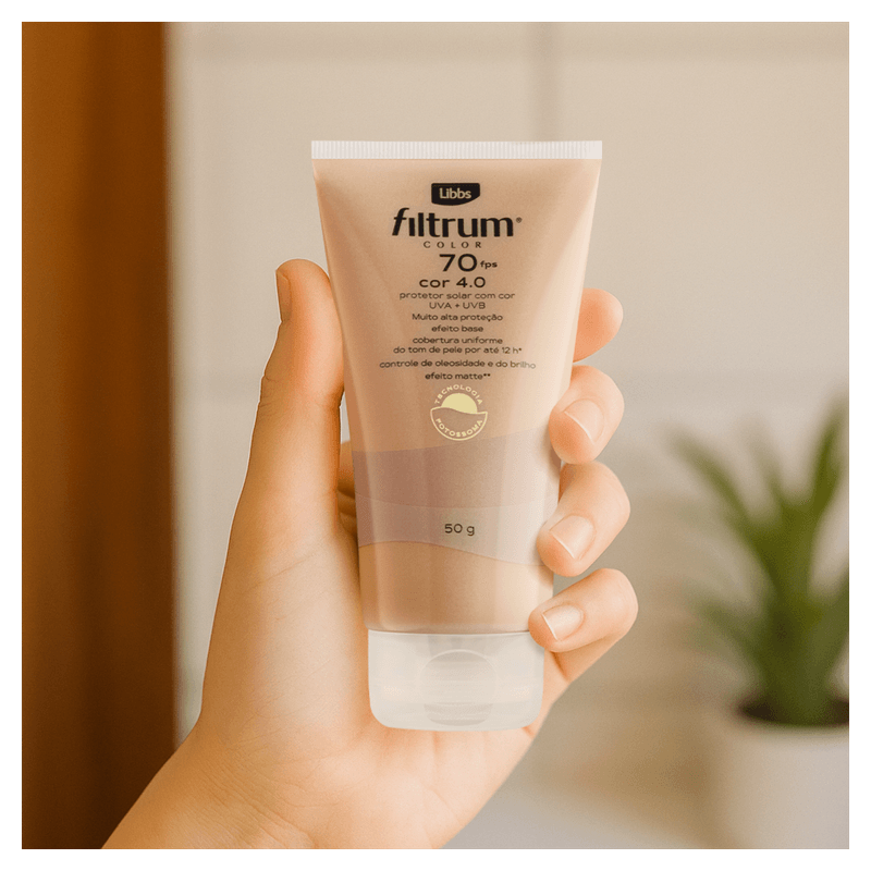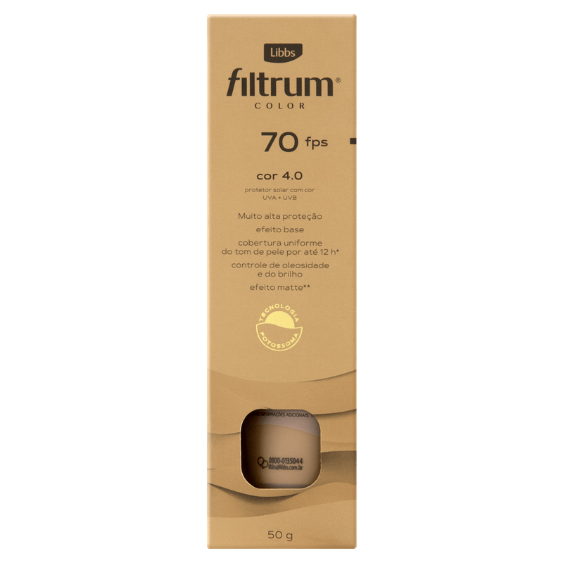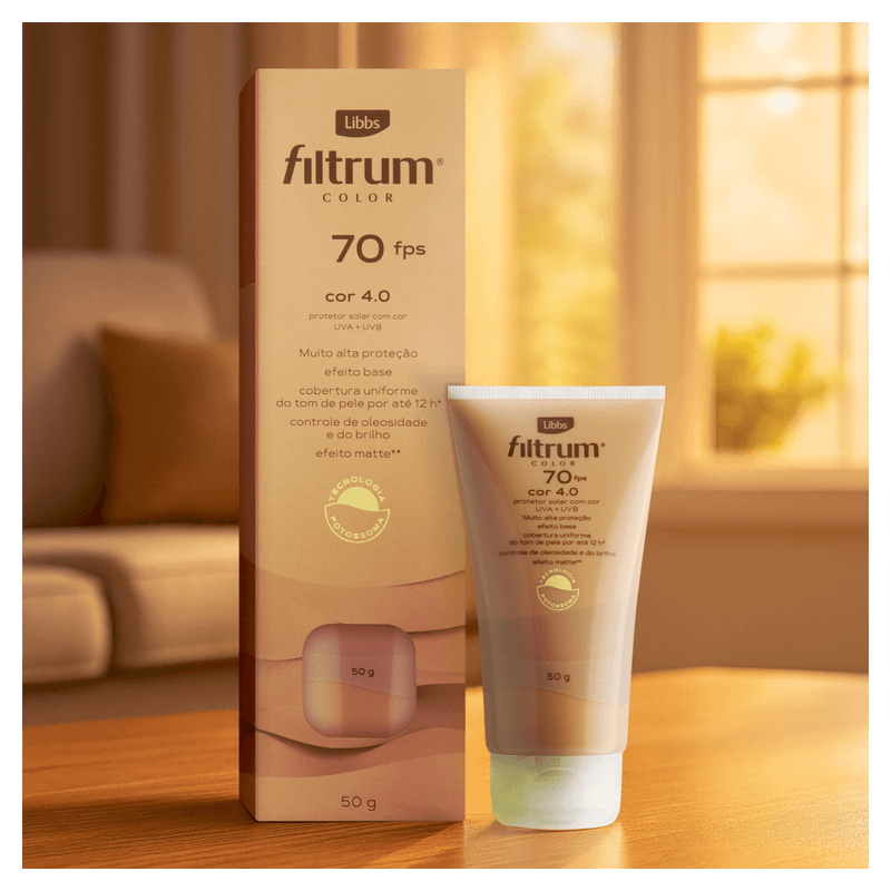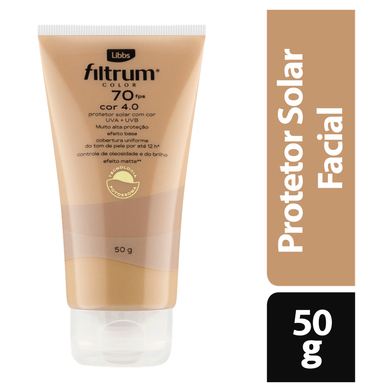 O Protetor Solar Filtrum Color FPS 70 Cor 4 é um protetor solar facial com cor, apresentado em bisnaga de 50g. Com textura cremosa e acabamento matte, oferece alta proteção contra os raios UVA e UVB, controle de oleosidade e cobertura uniforme do tom da pele.