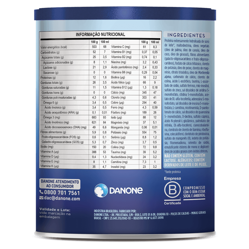 A fórmula contém maltodextrina, óleos vegetais, fibras alimentares, vitaminas, minerais e outros nutrientes essenciais para o crescimento saudável. Não contém glúten, mas possui lactose e proteína hidrolisada de soro de leite. O uso deve ser sempre supervisionado por médico ou nutricionista, respeitando a prescrição profissional.