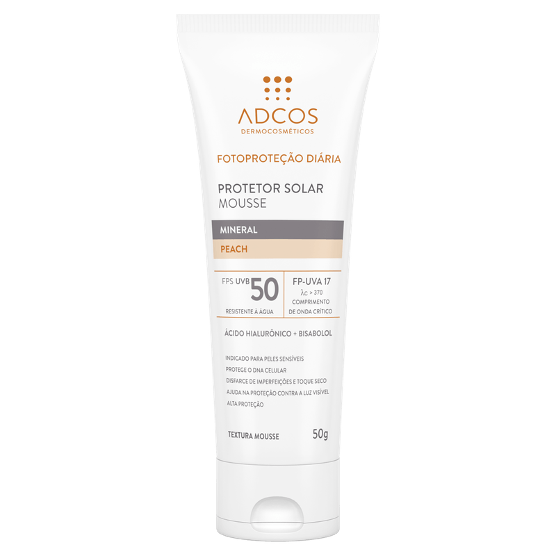 O Fotoprotetor Adcos Mousse Mineral FPS 50 50g é um protetor solar em textura mousse, formulado com filtros minerais que proporcionam alta proteção contra os raios UVA, UVB, infravermelho, luz visível e poluição. Indicado para todos os tipos de pele, especialmente as oleosas, oferece controle da oleosidade e efeito mate com toque seco.