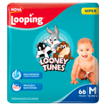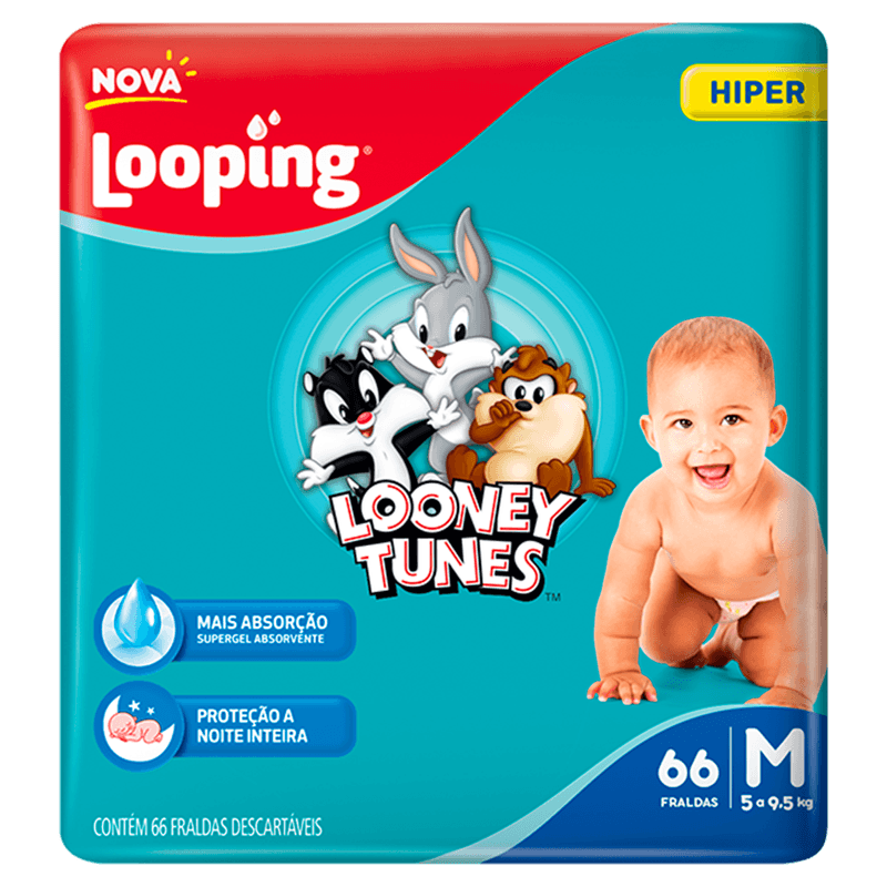 A Fralda Looping Looney Tunes Hiper tamanho M é ideal para bebês de 5 a 9,5 kg, oferecendo alta absorção com tecnologia de gel superabsorvente que mantém a pele seca por até 10 horas. Com multicamadas e barreiras duplas anti-vazamento, garante proteção prolongada, inclusive durante a noite. Seu design conta com cintura elástica e fecho adesivo ajustável, proporcionando conforto e ajuste seguro, além de estampas divertidas dos personagens Looney Tunes que tornam a troca mais agradável para pais e bebês.