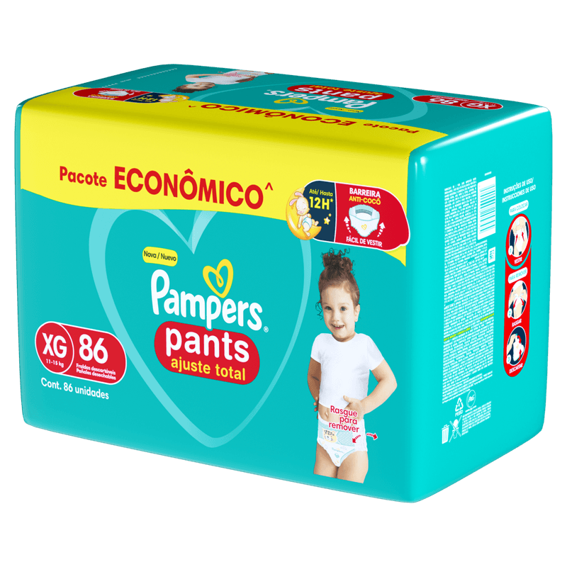 A Fralda Descartável Infantil Pants Pampers Ajuste Total tamanho XG é indicada para crianças com peso entre 11 e 15 kg, oferecendo proteção e conforto para uso prolongado, inclusive durante a noite. Desenvolvida no formato de roupinha, proporciona ajuste seguro e liberdade de movimento para o bebê.