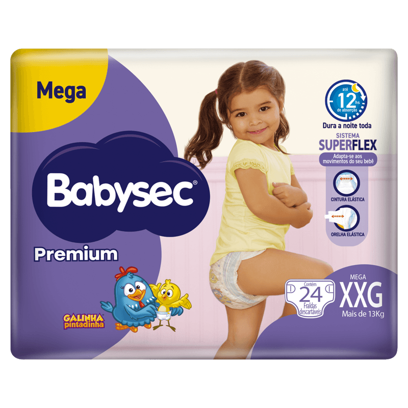 A Fralda Descartável Babysec Premium Galinha Pintadinha XXG oferece até 12 horas de proteção com tecnologia de ultraabsorção, gel superabsorvente e barreiras duplas anti-vazamento reforçadas. Com cintura e orelhas elásticas, além de fechos adesivos reajustáveis, garante conforto e ajuste perfeito para bebês acima de 13 kg. A estampa divertida da Galinha Pintadinha torna o uso mais lúdico e atrativo para as crianças.