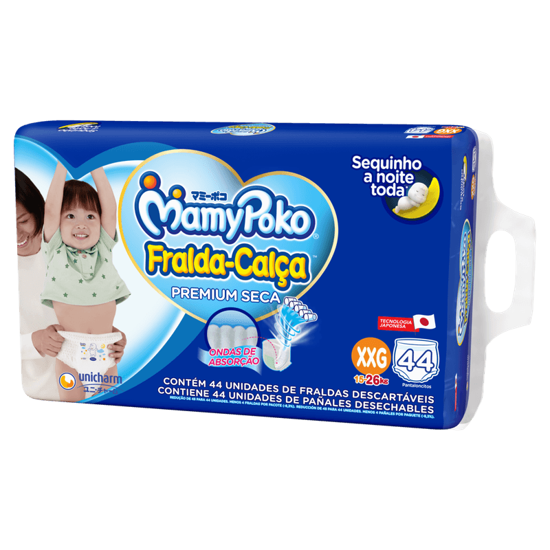 A Fralda-Calça Mamypoko Premium Seca XXG é ideal para bebês de 15 a 26 kg que precisam de conforto e proteção prolongada. Com 44 unidades, oferece alta absorção, mantendo a pele seca por até 12 horas graças à sua camada extra e tecnologia japonesa avançada. Seu design em formato de calça proporciona ajuste perfeito e liberdade de movimento, facilitando a troca e garantindo segurança contra vazamentos com barreiras duplas laterais. Indicada para crianças ativas, é hipoalergênica e possui caminhos de ar que promovem melhor circulação, prevenindo irritações.