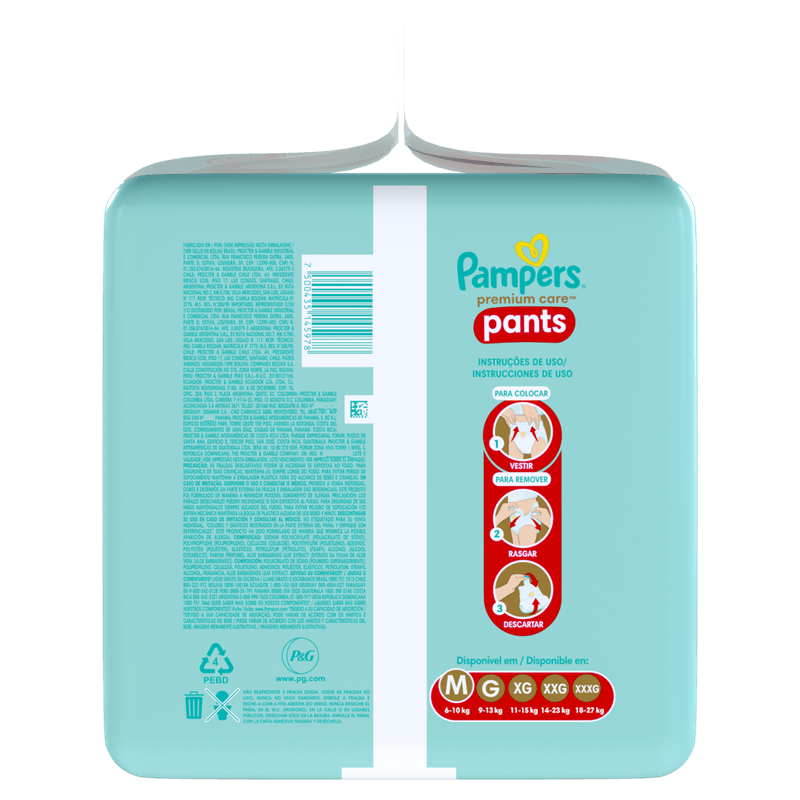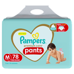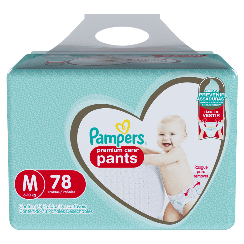 A Pampers Premium Care Pants M possui barreiras duplas anti-vazamento, gel superabsorvente e ajuste flexível, garantindo segurança e conforto para peles sensíveis. Dermatologicamente testada, sem parabenos e com toque suave como algodão, é indicada para bebês que necessitam de proteção prolongada e praticidade no dia a dia. A embalagem contém 78 fraldas em formato pants, facilitando o uso para bebês ativos e em crescimento.