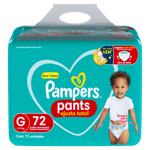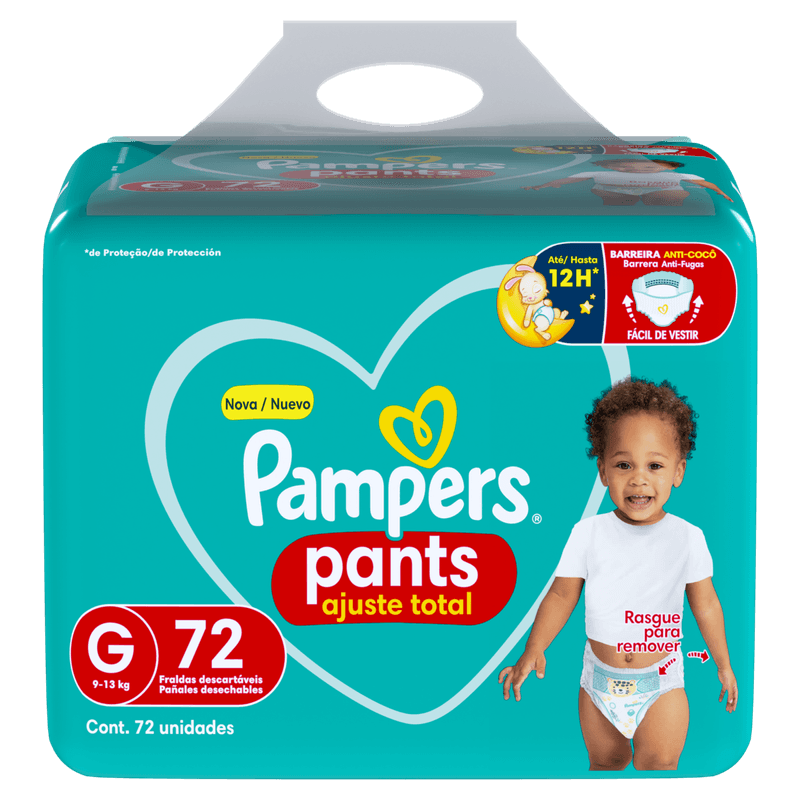 A Fralda Pampers Pants Ajuste Total tamanho G, com 72 unidades, oferece cintura elástica 360° que se adapta perfeitamente ao corpo do bebê, garantindo conforto e liberdade de movimento. Seu sistema de ajuste inteligente facilita o vestir, mesmo com o bebê ativo, enquanto a camada ultra absorvente com gel superabsorvente proporciona até 12 horas de proteção contra vazamentos e assaduras. Indicada para bebês de 9 a 13 kg, essa fralda tipo roupinha mantém a pele seca e respirável graças aos canais de ar, além de contar com um indicador de umidade que avisa o momento ideal para a troca.