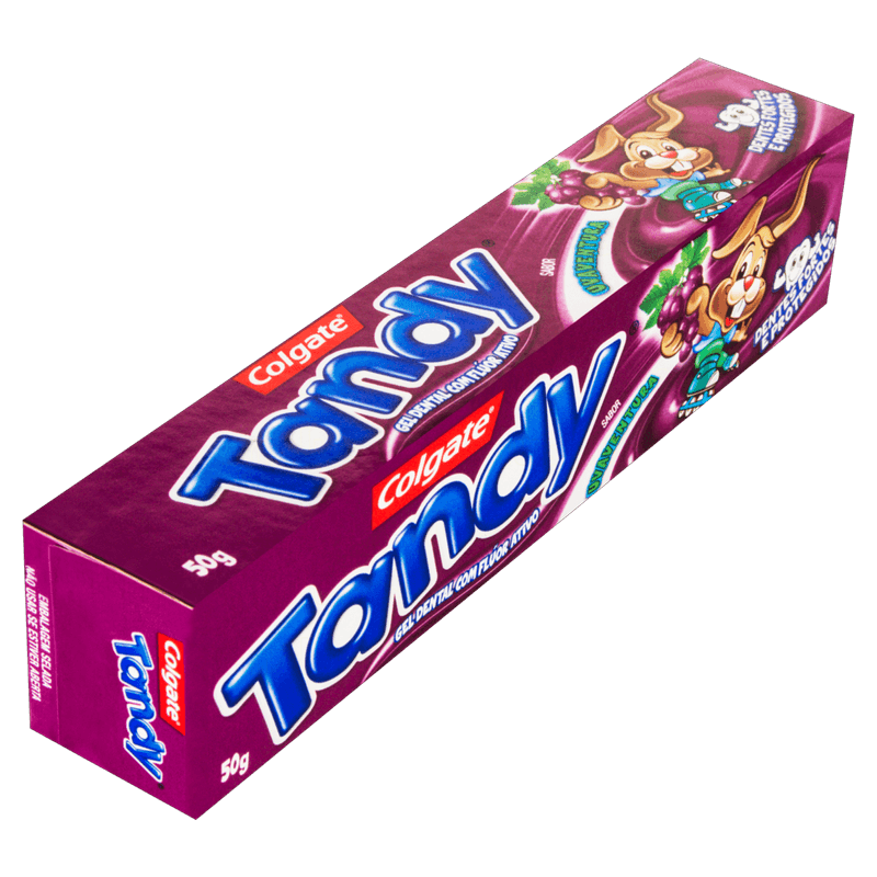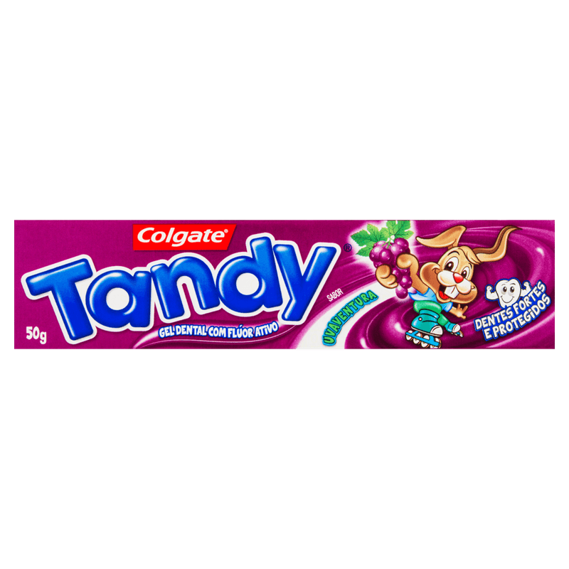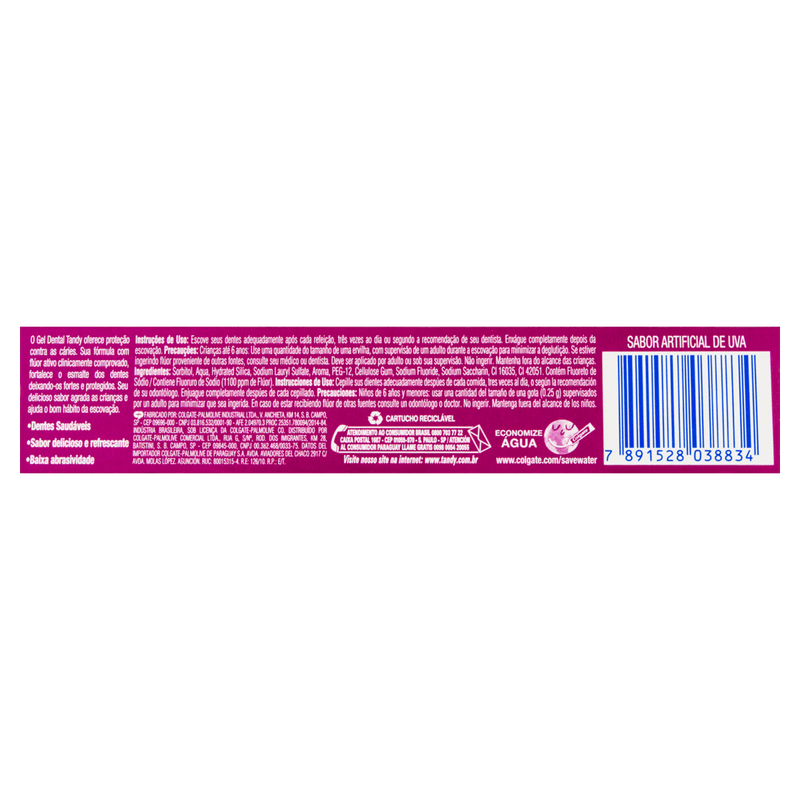 O Gel Dental Infantil Tandy Uva é apresentado em tubo de 50g, especialmente formulado para crianças a partir de 2 anos. Com sabor suave de uva, o produto tem como principal finalidade a proteção dos dentes contra cáries, promovendo a higiene bucal e o fortalecimento do esmalte dental.