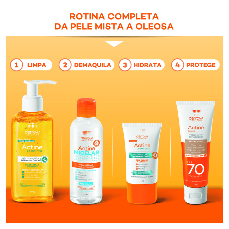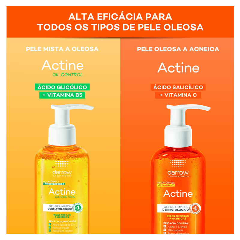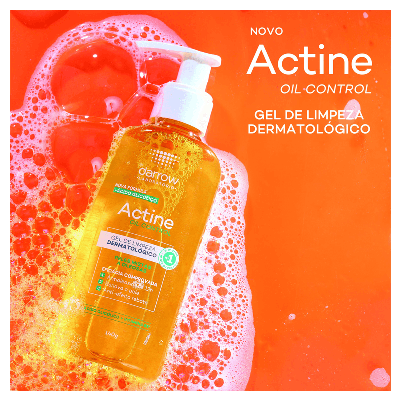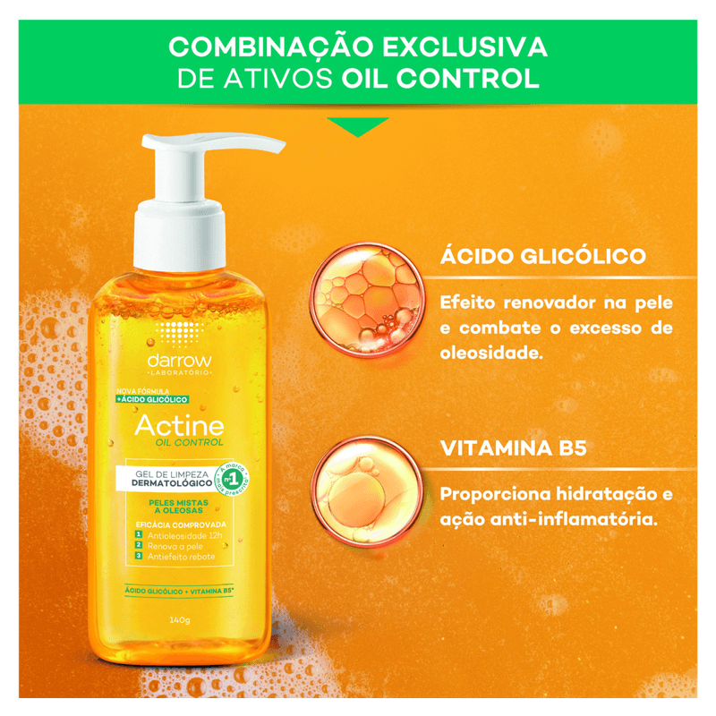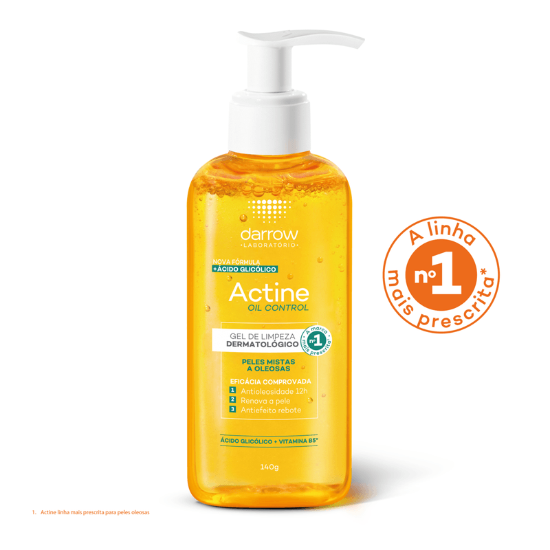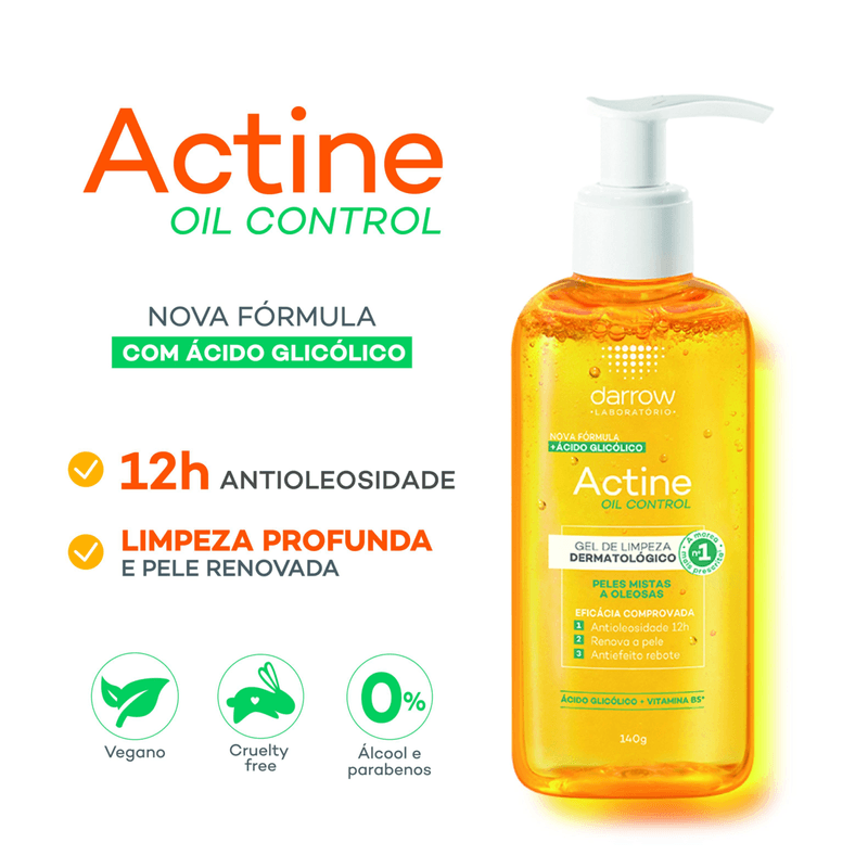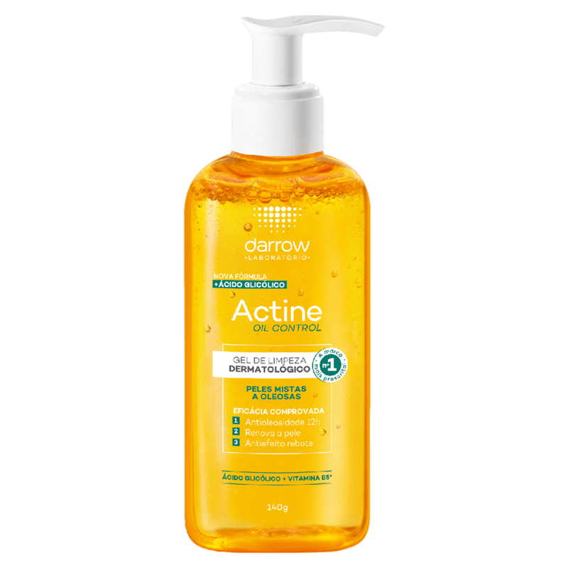 O Gel de Limpeza Darrow Actine Control 140g é ideal para peles mistas a oleosas, oferecendo controle eficaz da oleosidade por até 9 horas e limpeza profunda. Sua fórmula com ácido salicílico 2%, ácido glicólico, vitamina C, vitamina B5, P-refinyl e lactato de mentila combate acne, cravos e reduz poros dilatados, promovendo uma pele matificada, uniforme e com sensação refrescante.