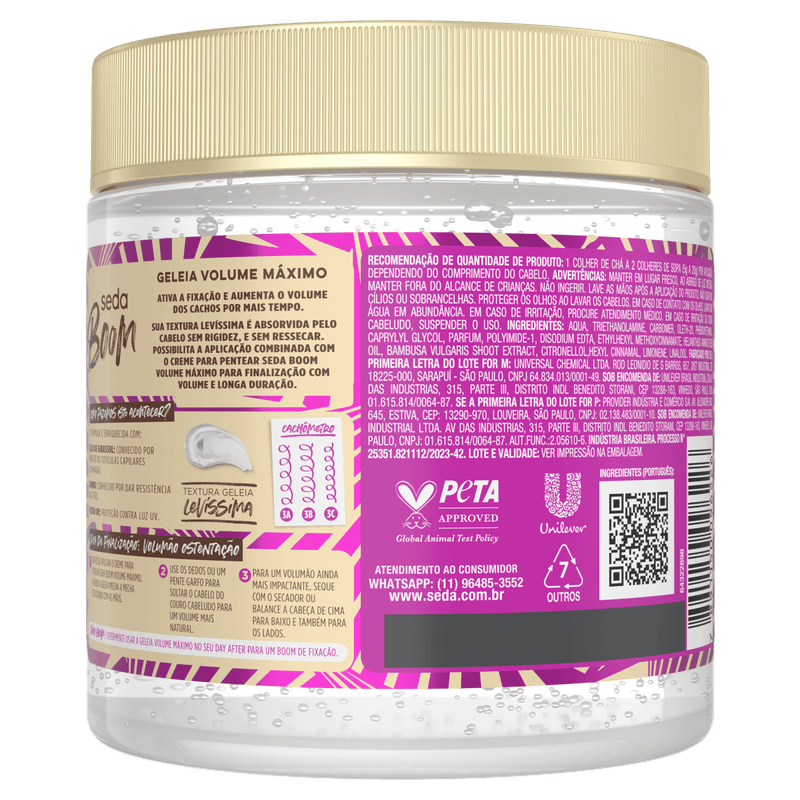 A Geleia Seda Boom Volume Máximo foi feita pra quem ama cachos com vida, presença e aquele volumão poderoso! Com fórmula liberada, textura leve e ingredientes que tratam enquanto definem, ela ativa os cachos, proporciona volume natural e garante fixação duradoura sem rigidez. Ideal para cabelos cacheados das curvaturas 3ABC, sua ação antirrigidez e antirressecamento protege os fios, alinha e dá aquele toque de resistência para enfrentar o dia com muito estilo.