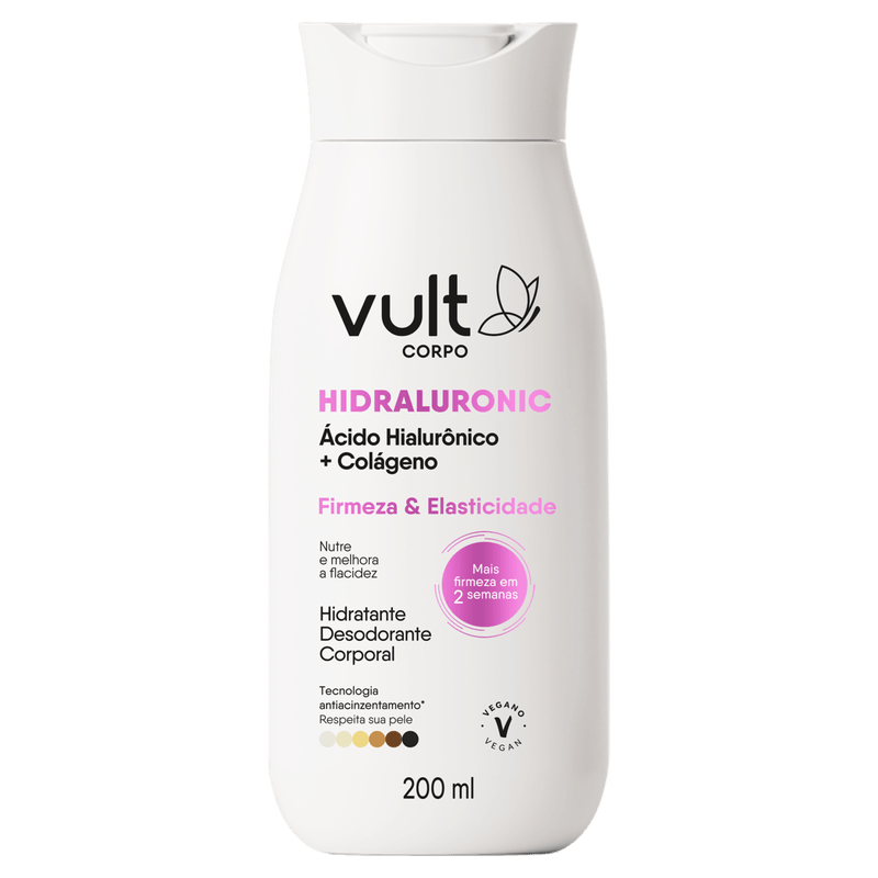 O Hidratante Desodorante Corporal Vult Corpo Hidraluronic Firmeza & Elasticidade incentiva você a se sentir confiante em sua pele e confortável em seu dia a dia. Esta loção combina Ácido Hialurônico e Colágeno para uma pele firme e elástica. Com Tecnologia Antiacinzentamento, previne o aspecto cinza da pele.