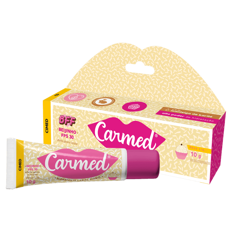 Carmed BFF Beijinho é um hidratante labial com alto poder de hidratação e evita rachaduras, deixando os lábios macios e saudáveis. Possui efeito gloss incolor e FPS 30.