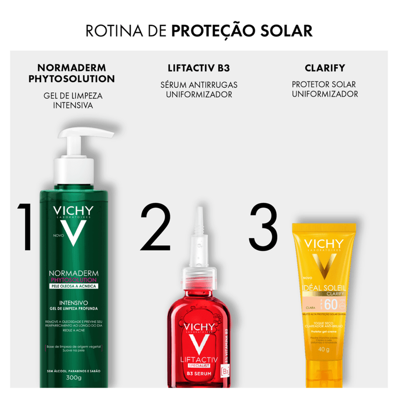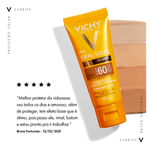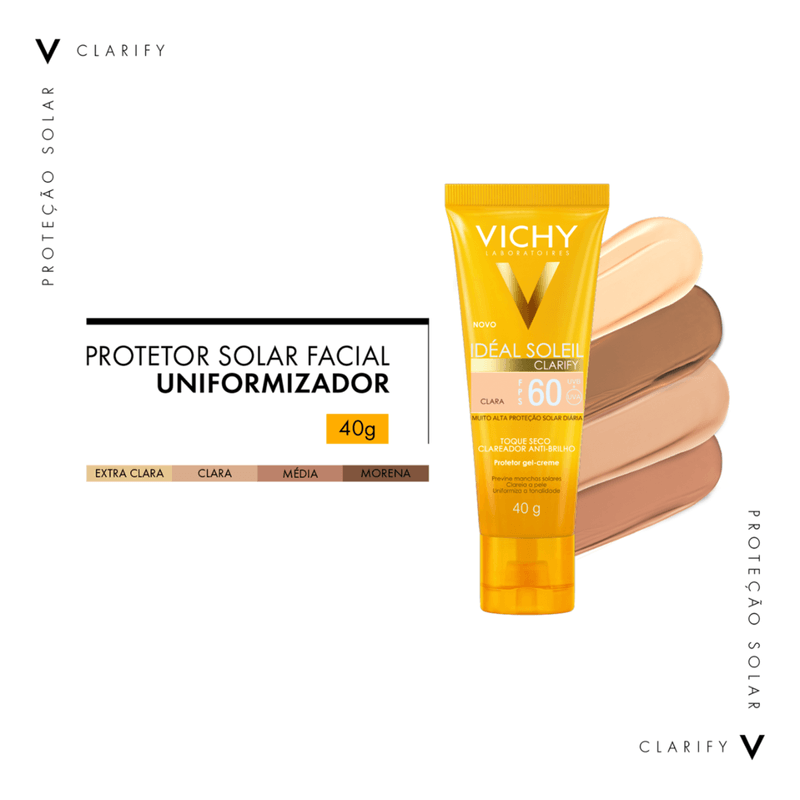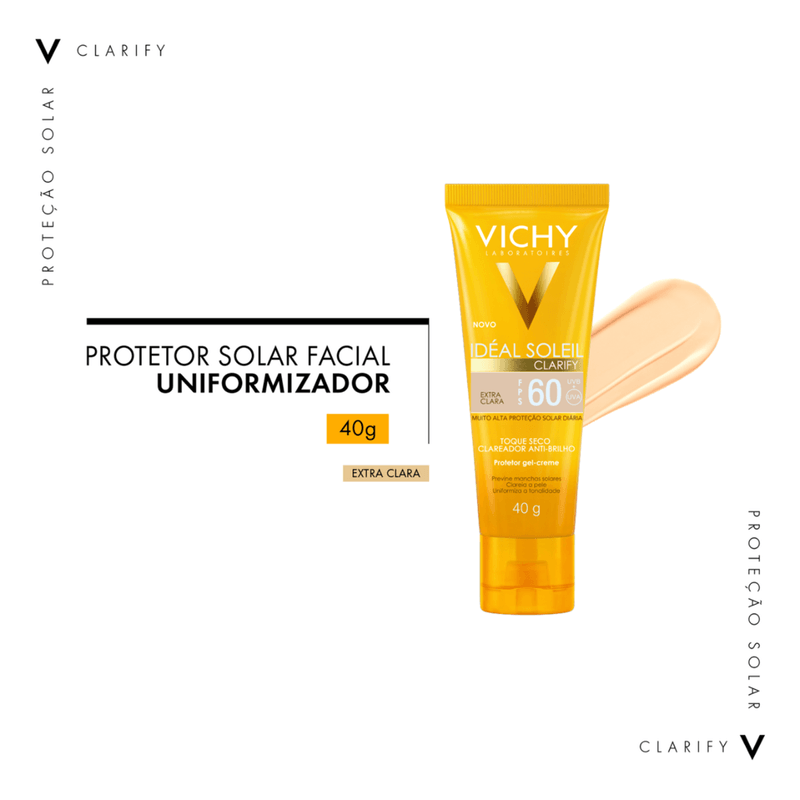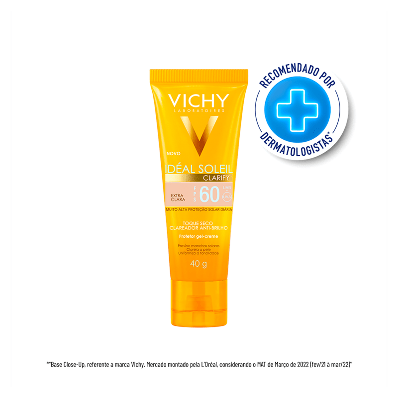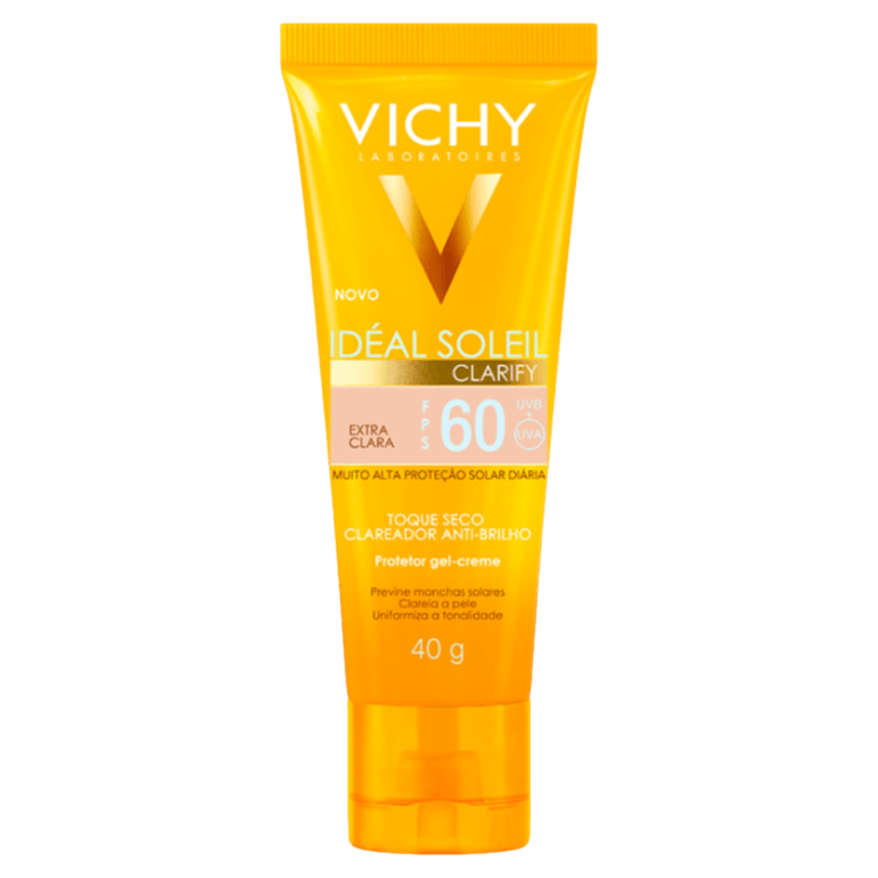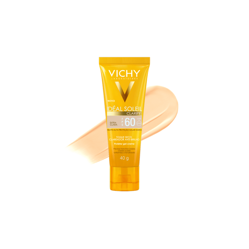 O Ideal Sol Protetor Solar Extra Clara FPS 60 da Vichy Ideal Soleil é um protetor solar facial com cor, em textura gel creme de toque seco, indicado para peles claras. Oferece alta proteção contra os raios UVA, UVB e luz visível, com ação 4 em 1: protege, clareia, uniformiza e matifica a pele.