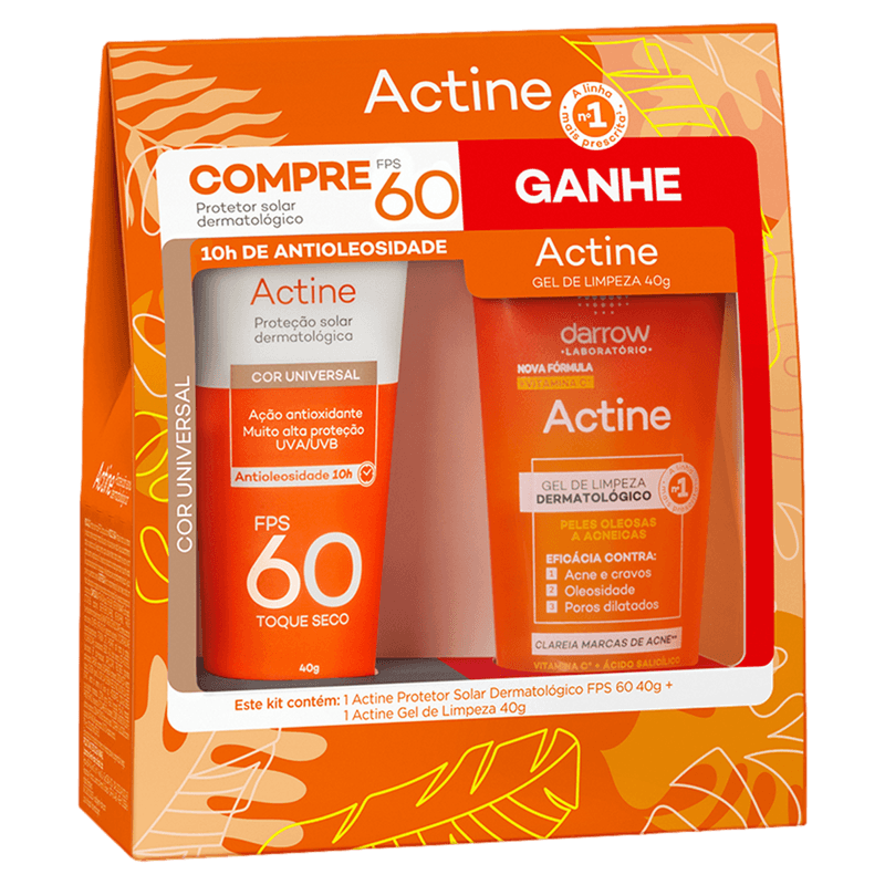 O Kit Actine é composto por um protetor solar com cor FPS 60 em creme e um gel de limpeza facial em gel, ambos indicados para peles oleosas e acneicas. O protetor solar oferece alta proteção contra os raios UVA e UVB, controle da oleosidade por até 10 horas e uniformiza o tom da pele com sua tecnologia Smart Color. O gel de limpeza promove higienização profunda, reduz a oleosidade e combate acne e cravos.