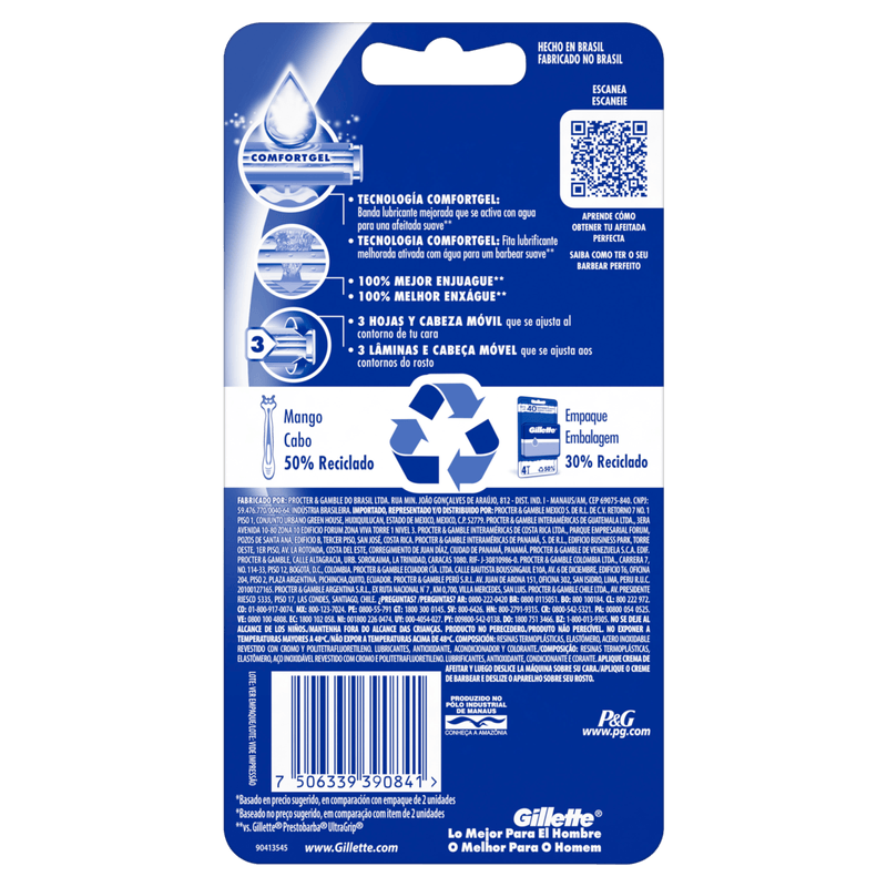 A lâmina descartável Gillette Prestobarba3 agora oferece até 10 soft shaves com sua nova tecnologia Comfortgel. Durante o barbear a água ativa o lubrincato, estende-se, tornando-se uma camada protetora entre a pele e as folhas, para um barbear liso e flush. Para uma melhor experiência, experimente a Espuma de Barbear Prestobarba para um melhor barbear.