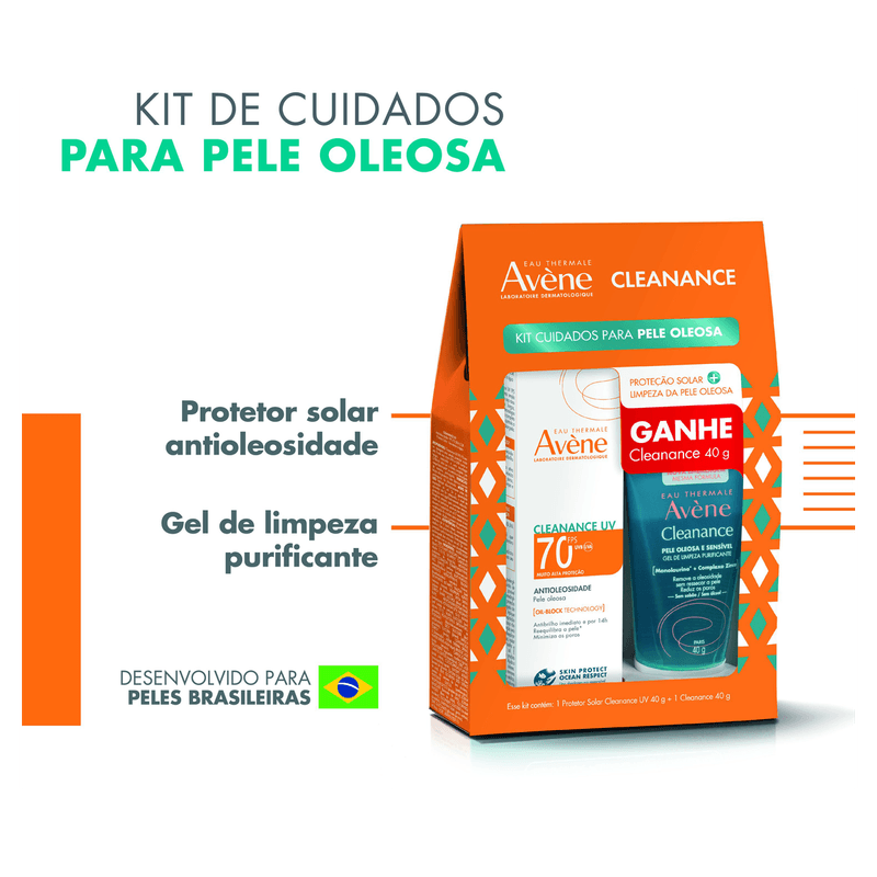 O Kit Avéne Cleanance é composto por um protetor solar facial FPS 70 em creme com textura ultra leve e um gel de limpeza purificante para peles oleosas. O protetor solar oferece alta proteção contra raios UVA e UVB, controle da oleosidade por até 14 horas e efeito mate, enquanto o gel de limpeza remove impurezas, reduz cravos e poros, promovendo uma pele mais limpa e equilibrada.