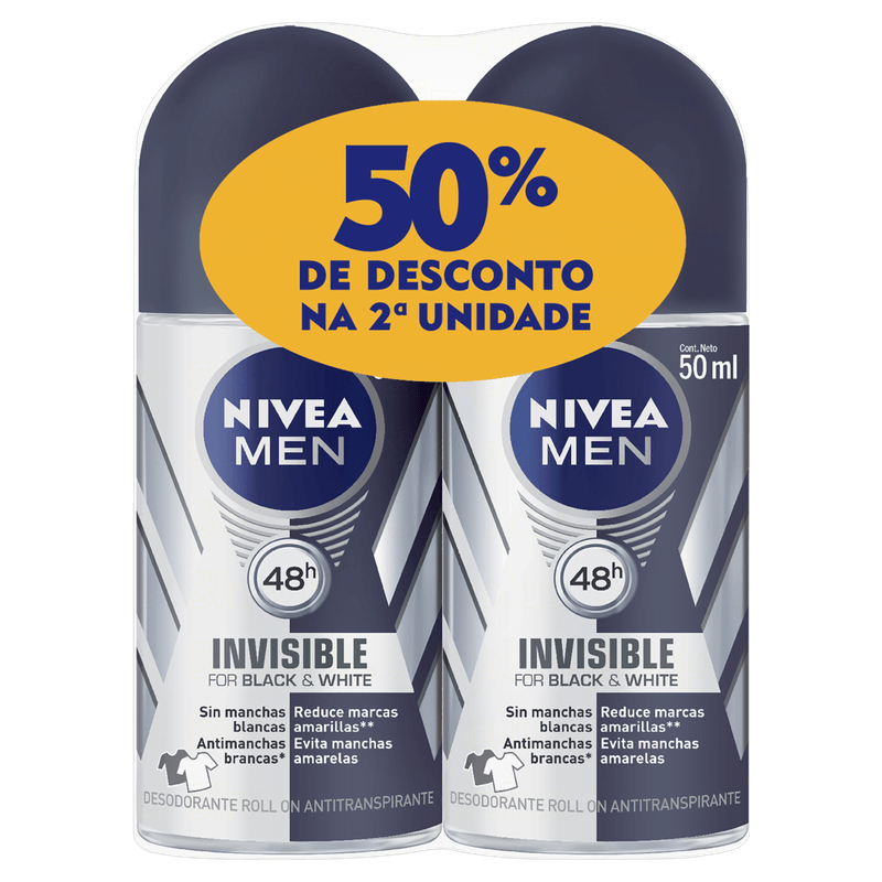 Pack Antitranspirante Roll-On Invisible Black & White Nivea Men 2 Unidades 50ml Cada Grátis 50% de Desconto na 2ª Unidade