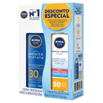 O Kit Nivea Sun Protect & Hidrata reúne um protetor solar corporal FPS 30 em loção de 200 ml e um protetor solar facial Beauty Expert FPS 50 em creme de 50 g. Ambos são formulados para oferecer proteção contra os raios UVA e UVB, com hidratação para a pele durante a exposição solar.