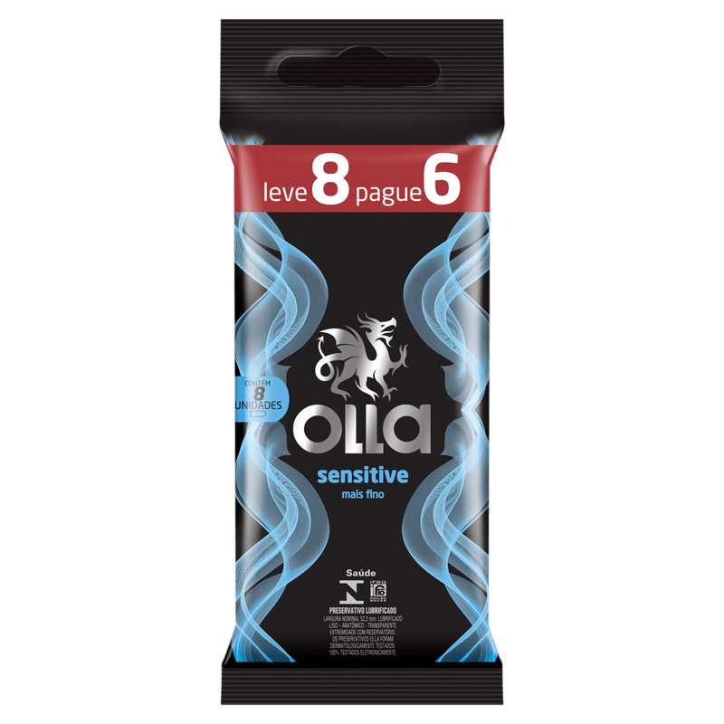 O Preservativo Sensitive Mais Fino da marca Olla é um preservativo lubrificado feito de látex de borracha natural vulcanizada, disponível em embalagem com 8 unidades. Ele é 15% mais fino que os preservativos tradicionais, oferecendo maior sensibilidade e conforto durante a relação sexual, garantindo proteção e segurança.