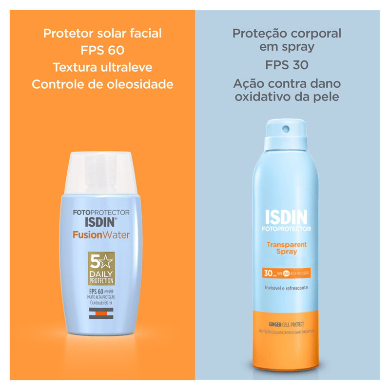 O Kit Protetor Solar Isdin Fusion Water oferece proteção completa para rosto e corpo, combinando praticidade e alta eficácia. O protetor facial Fusion Water FPS 60 possui textura ultraleve, toque seco e efeito refrescante, ideal para peles oleosas ou com tendência à acne. Já o aerossol corporal FPS 30 facilita a aplicação com spray invisível e refrescante, perfeito para uso diário e atividades ao ar livre. Ambos são resistentes à água, garantindo proteção duradoura contra os raios UVA e UVB.