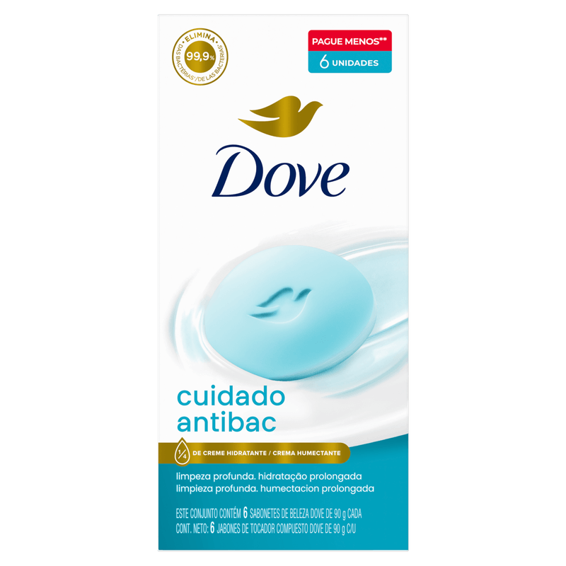 A fórmula suave da barra de beleza de Dove, tem propriedades capazes de eliminarem até 99,9% das bactérias e é enriquecida com exclusivo creme hidratante. Sua fórmula combina a proteção com a hidratação que só Dove proporciona para uma pele incrível. Dove Cuida e Protege oferece uma limpeza suave, perfeita para uso diário, sem agredir a sua pele. Você pode utilizar a barra de beleza de Dove para o rosto, corpo e mãos. Sua fórmula nutritiva com PH neutro hidrata enquanto limpa, para que você não precise se preocupar com o ressecamento da pele. Dove cuida e protege de você para que você possa apreciar a pele macia e suave que você merece.