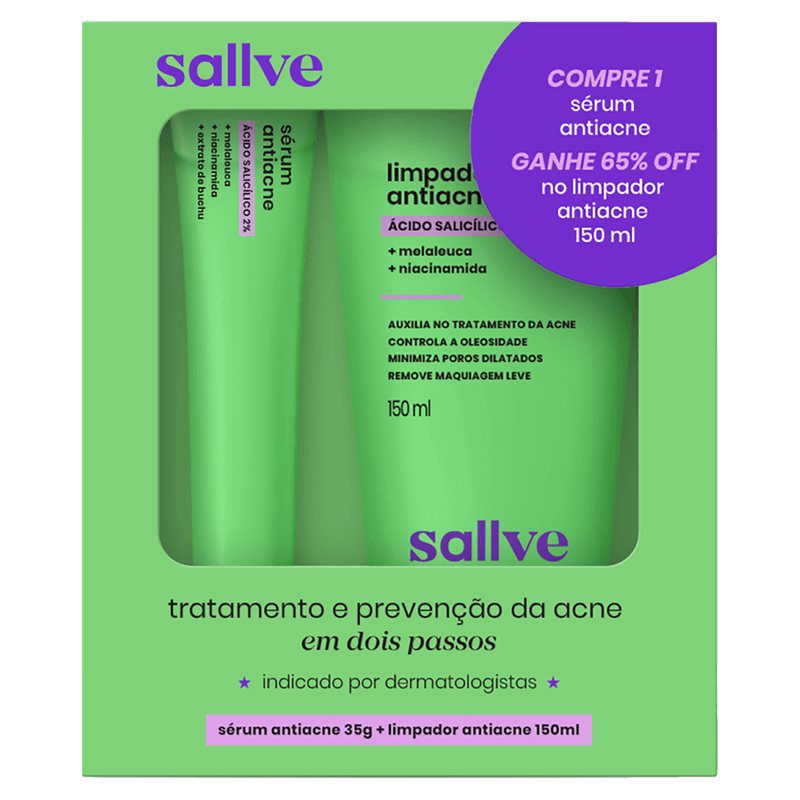 A linha antiacne Sallve é composta por dois produtos potentes e complementares no tratamento da acne: o Gel-Espuma Limpador Facial Antiacne Sallve e o Sérum Antiacne Sallve. Juntos, eles oferecem uma rotina completa de cuidados com a pele acneica, proporcionando limpeza profunda, tratamento ativo e prevenção de cravos e espinhas, sem ressecar ou agredir a pele.