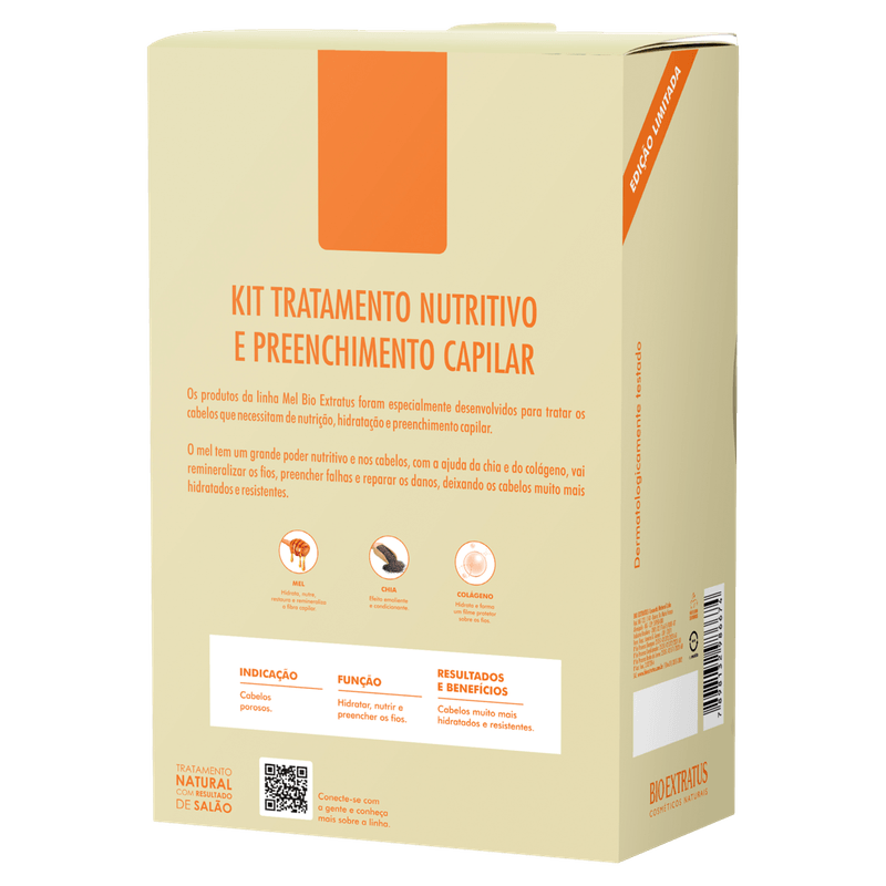 O Kit Nutritivo Bio Extratus Mel foi desenvolvido para hidratar profundamente, nutrir e remineralizar cabelos porosos ou danificados. Com mel, chia e colágeno, o kit preenche falhas, repara danos e forma um filme protetor sobre os fios, deixando-os mais fortes, hidratados e com brilho natural.