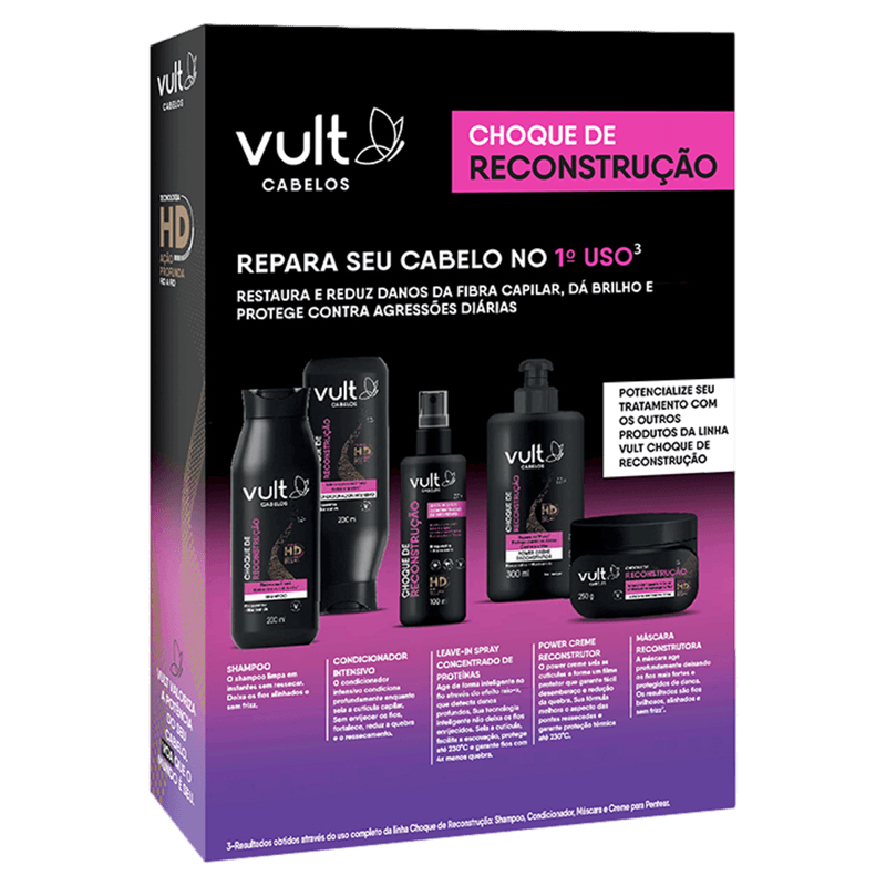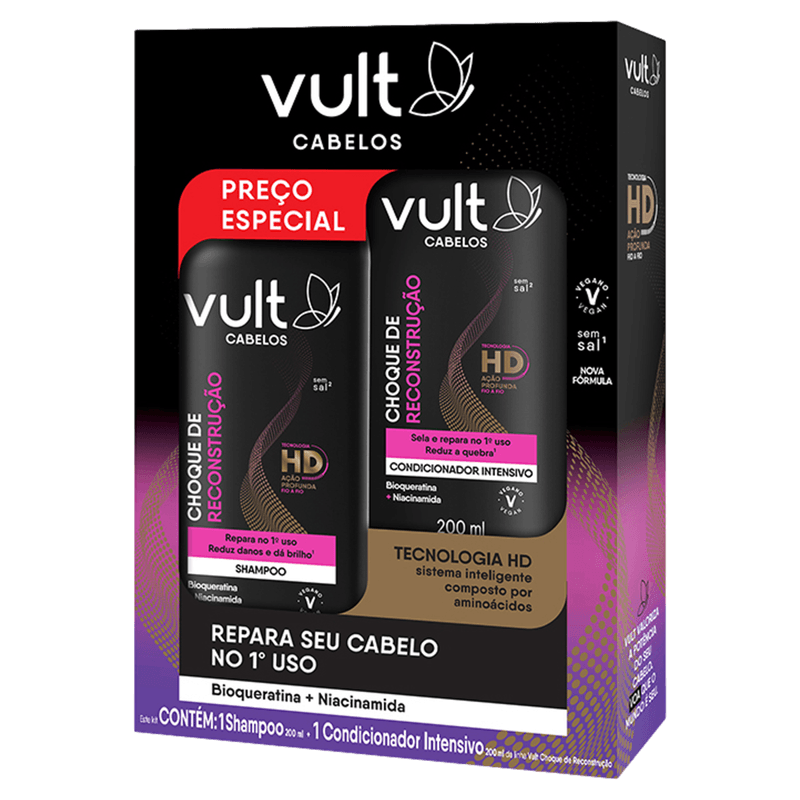 Vult valoriza a potência do seu cabelo. Desenvolvida com tecnologia HD: sistema inteligente composto por aminoácidos, que são reconhecidos pelo alto potencial reparador e agem profundamente fio a fio. Manifeste seu cabelo. Voa que o mundo é seu. Vult Choque de Reconstrução¹, com bioqueratina e niacinamida, restaura a fibra capilar, reduz danos e protege contra agressores diários (sol, secador, processos químicos, entre outros). O shampoo limpa os fios em instantes, sem ressecar. Sua fórmula deixa os fios alinhados e sem frizz. Fórmula vegana e livre de sal², parabenos e petrolatos (óleo mineral e parafina).