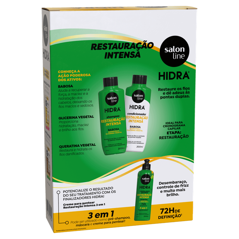 O Kit Shampoo + Condicionador Salon Line Hidra Babosa é composto por um shampoo que promove uma limpeza da raiz as pontas e um condicionador que hidrata e restaura profundamente os fios, além de desembaraçar e selar as cutículas, deixando os fios macios e saudáveis.