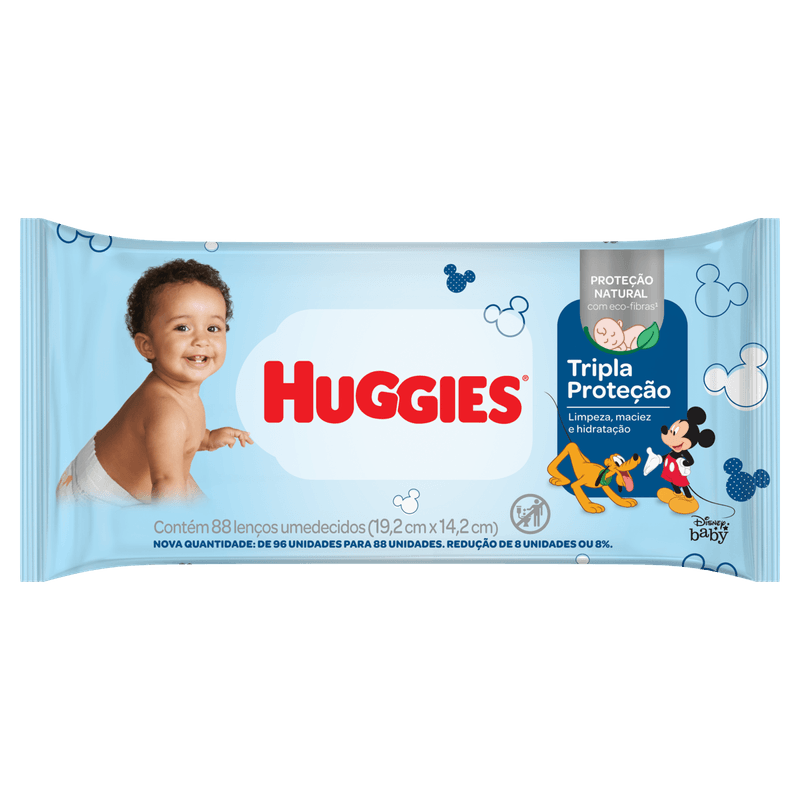 O Lenço Umedecido Disney Baby Huggies Tripla Proteção é apresentado em embalagem com 88 unidades, desenvolvido especialmente para bebês e crianças. Com fibras naturais e toque macio, oferece uma limpeza suave e eficaz, promovendo higiene e proteção da pele delicada.