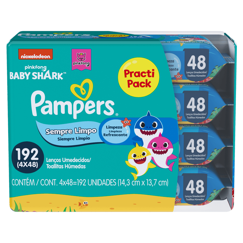 O Lenço Umedecido Pampers Splash Baby Shark é um produto infantil apresentado em embalagem econômica com 192 unidades, ideal para a higiene suave da pele sensível de bebês e crianças. Sua fórmula delicada, sem álcool etílico, proporciona limpeza eficaz e proteção, mantendo a hidratação natural da pele durante a troca de fraldas e cuidados diários.