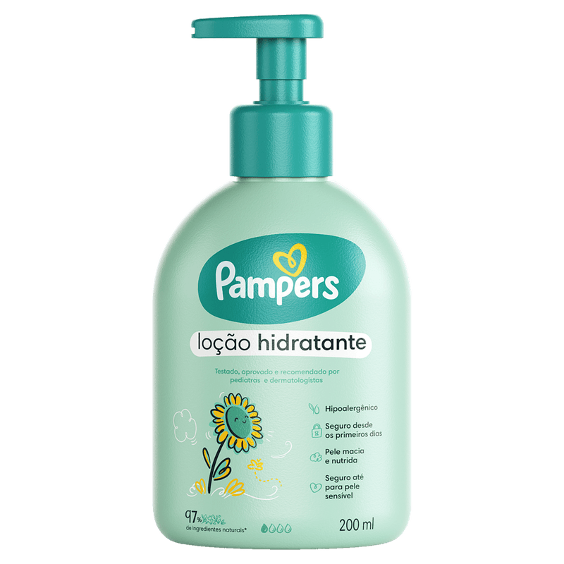 A Loção Hidratante Pampers® foi criada pensando em hidratar a pele já na primeira aplicação. Sua composição não contém nenhum Álcool Etílico, Fenoxietanol, Parabenos e corantes, trazendo maior suavidade e mantendo a pele do seu neném macia. Testado, aprovado e recomendado por pediatras e dermatologistas, a Loção Hidratante Pampers® é seguro até para a pele sensível.