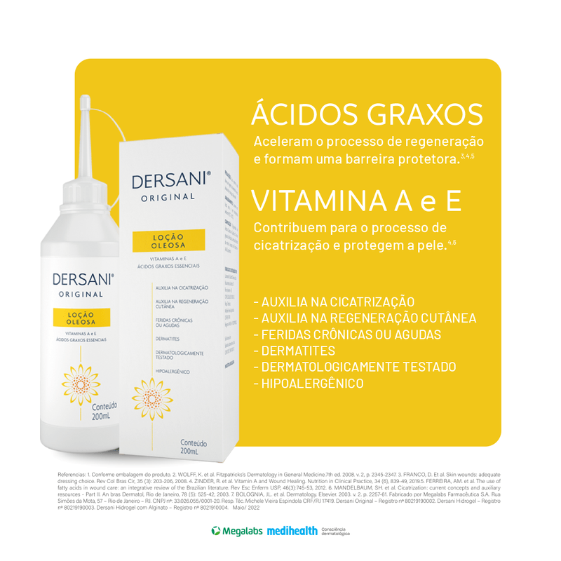 Dersani Original está indicado no auxilio do processo de cicatrização de feridas: úlceras por pressão (escaras) de graus I, II e III, úlceras venosas, arteriais e diabéticas; feridas decorrentes de queimaduras; tratamento de feridas crônicas ou agudas com ou sem infecção; tratamento de Eczemas: Atópico, Asteatósico, de Estase e Radiodermite.