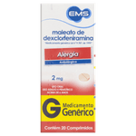 Maleato Dexclorfeniramina 2mg 20 Comprimidos - Genérico - EMS é um medicamento anti-histamínico indicado para o alívio rápido e eficaz dos sintomas alérgicos, como rinite, urticária, prurido, picadas de insetos, conjuntivite alérgica, dermatite atópica e eczemas. Seu princípio ativo bloqueia os efeitos da histamina, proporcionando alívio em cerca de 30 minutos com ação prolongada, ideal para adultos e crianças acima de 6 anos que buscam controle seguro e confiável das alergias.