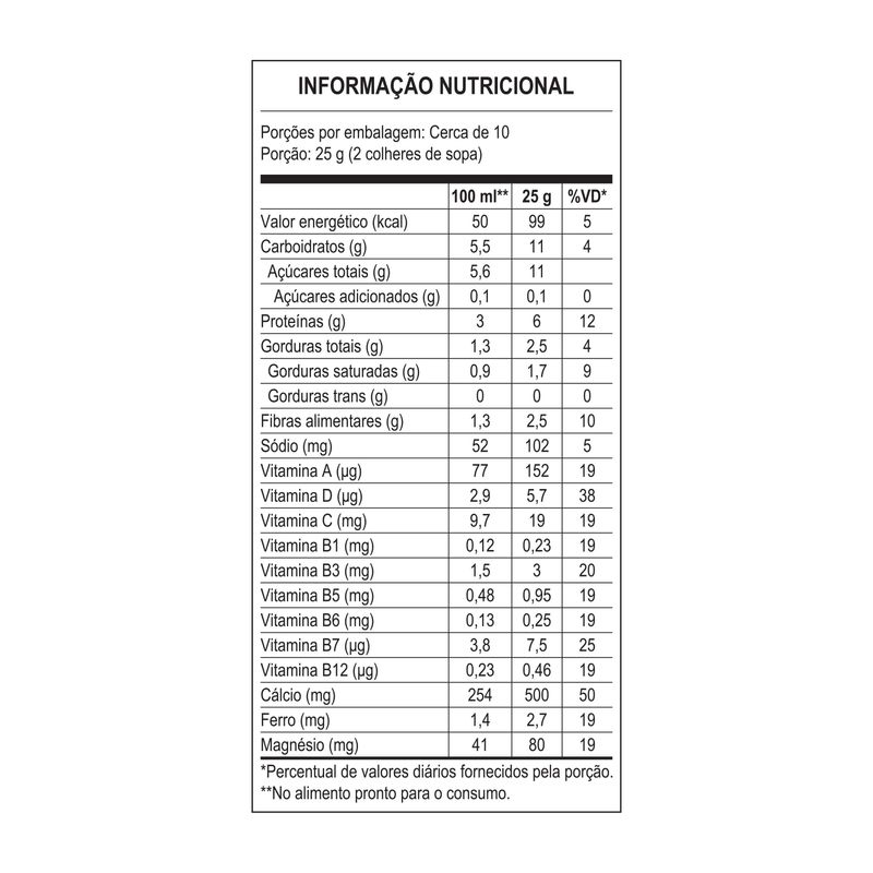 • Ingredientes principais: leite parcialmente desnatado, fibra solúvel (polidextrose), vitaminas e minerais