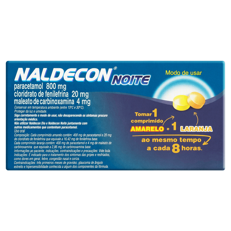Naldecon Noite é contraindicado para menores de 12 anos, pessoas com alergia aos componentes, hipertensão, glaucoma de ângulo estreito, hipertireoidismo, uso recente de inibidores da MAO e durante os primeiros três meses de gravidez. Apresentado em comprimidos, o produto possui tarja vermelha e é vendido sob prescrição médica, com embalagem contendo 24 unidades. Ideal para quem busca alívio completo dos sintomas gripais com segurança e eficácia comprovada.