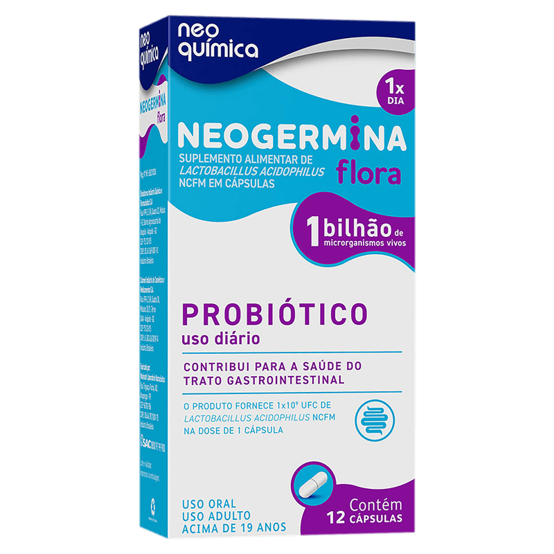 O Neogermina Flora 1 Bilhão Neo Química é um suplemento probiótico apresentado em cápsulas, indicado para a suplementação e complementação da saúde do trato gastrointestinal, promovendo o equilíbrio da flora intestinal.